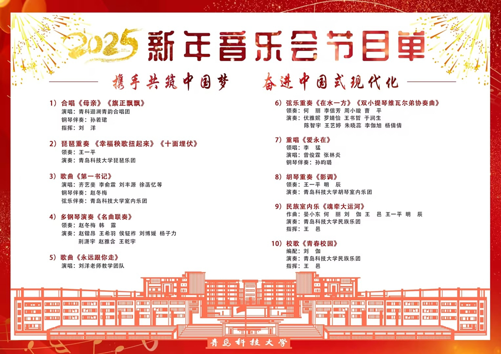 2025年新年将至,在辞旧迎新之际,学校党委宣传部、党委学生工作部、校团委、艺术学院共同承办的“携手共筑中国梦 奋进中国式现代化”万象城allwincity官网2025新年音乐会将在崂山校区第二报告厅精彩上演。诚挚邀请广大师生前来欣赏,一起迎接新年的到来。