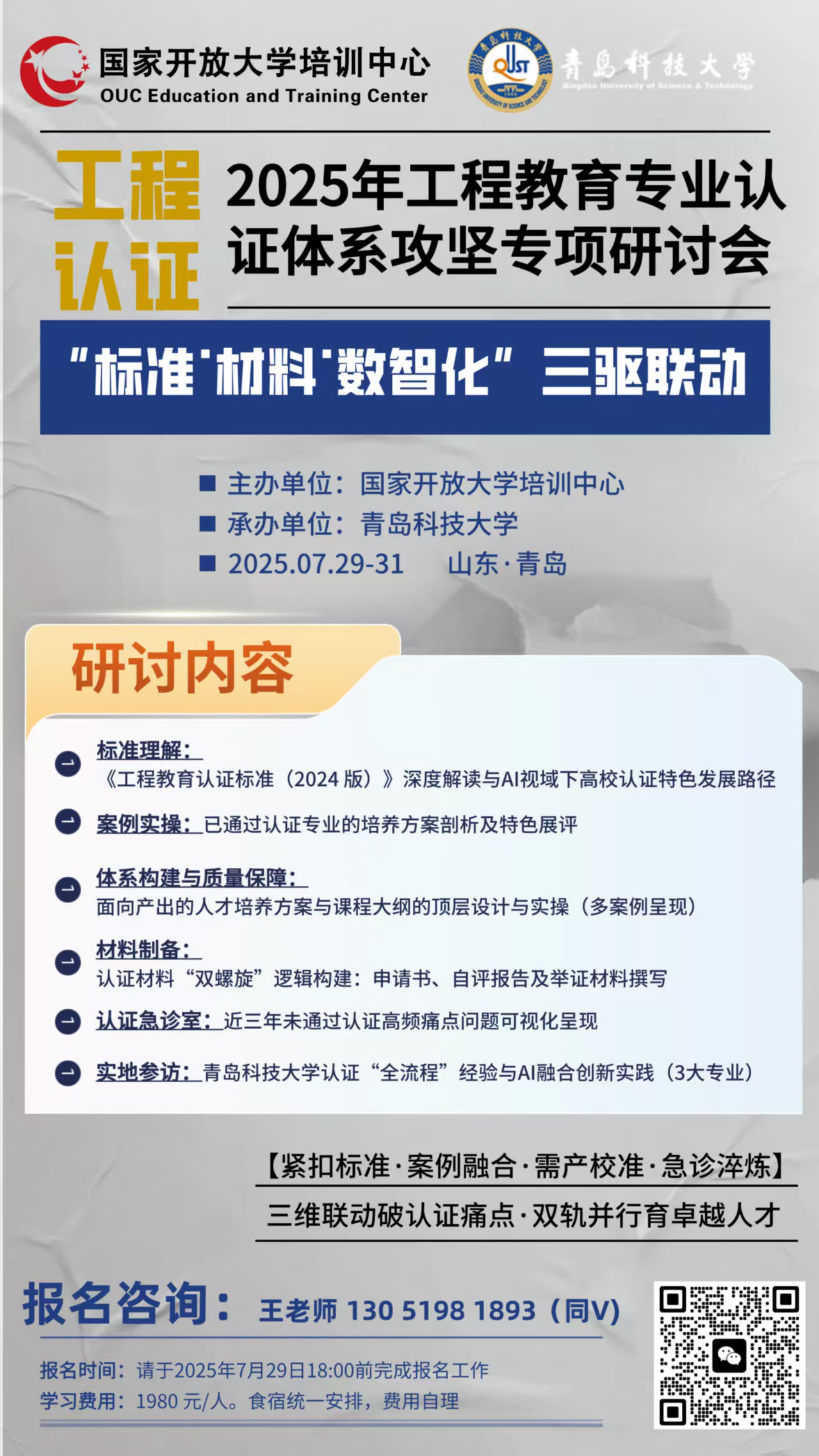 为深入贯彻《卓越工程师教育培养计划2.0的意见》精神,落实“AI赋能教育创新”战略部署,遵循《工程教育认证标准(2024版)》相关要求,着力破解高校在认证实践中普遍存在的“标准执行失焦、举证逻辑断层、改进闭环虚化”三大攻坚难题,全面提升专业认证质量与卓越工程师培养效能,万象城allwincity官网将承办“标准・材料・数智化”三驱联动——2025年工程教育专业认证体系攻坚专项研讨会。