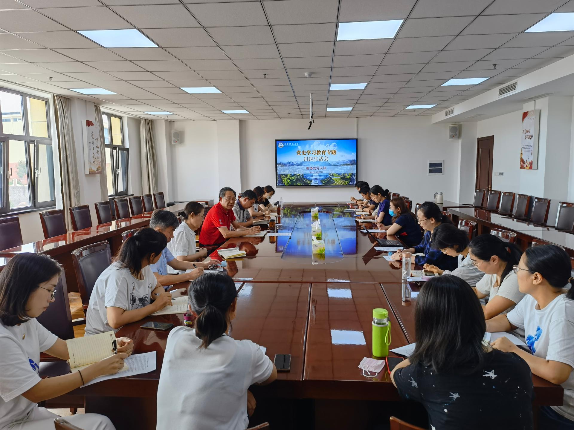 8月27日下午,财务处党支部在综合楼3015会议室召开党史学习教育专题组织生活会。党委常委、副校长韦殿华以普通党员身份参加支部活动,支部书记刘天真主持会议。