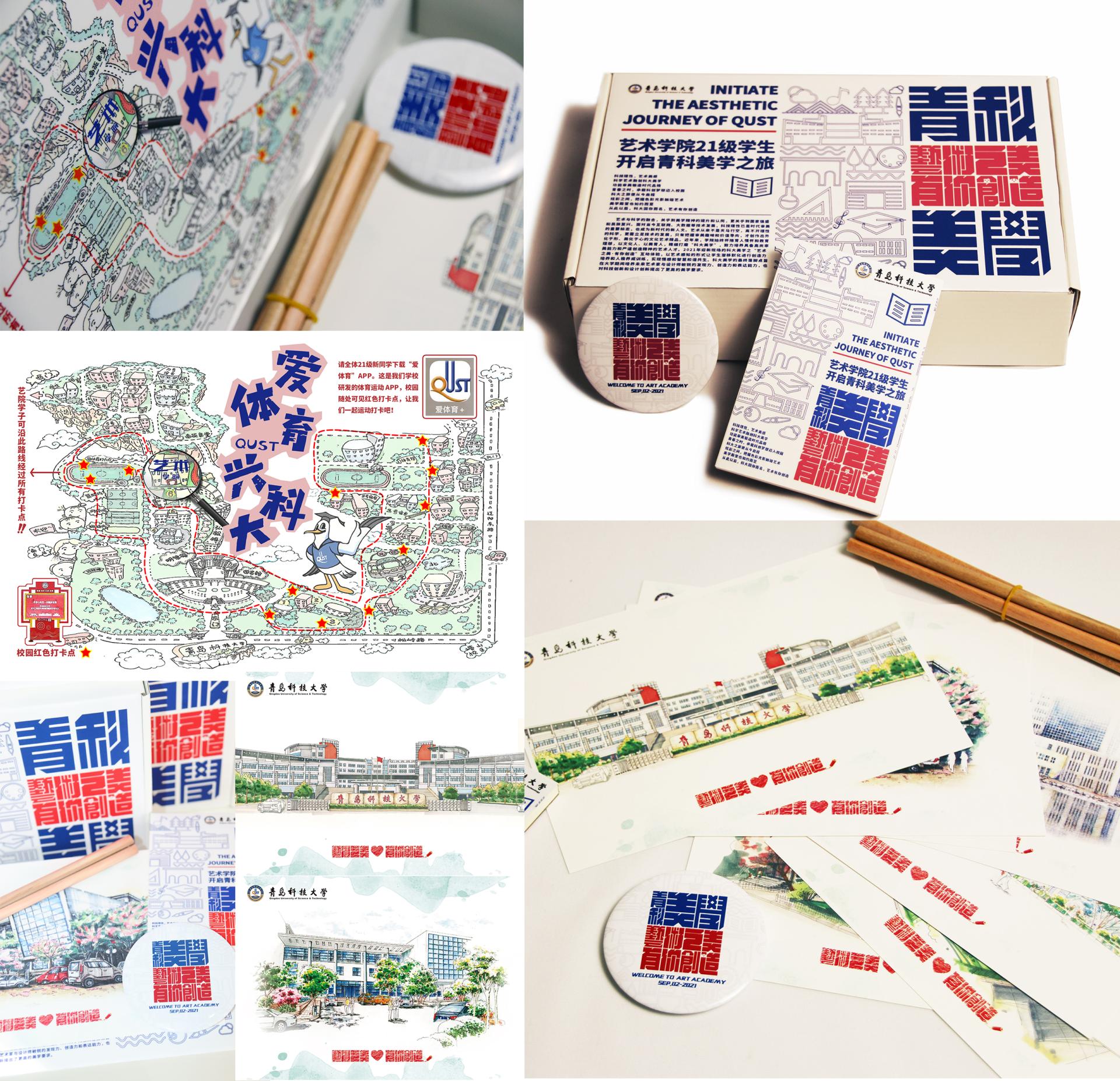 学院师生创新设计凝聚专业特色的新生“美学旅盒”,内置“爱体育 兴科大”手绘校园红色打卡地图、青科美学记录专属画具、新生最美表情标识胸章、艺院学子优秀作品明信片、日常防疫需品等五件套,将科大家风文化及艺术之美深度融合到迎新工作,实现五育并举。“爱体育·兴科大”手绘校园红色打卡地图旨在打通艺术学院体育综合改革新生“第一公里”,这也是学院具体落实三位“艺体”改革模式的新阶段体现;青科美学记录专属画具将手绘本与画笔搭配,旨在为艺术新生提供印记青科时光随笔;标识胸章凸显专业特色,以设计激发艺术灵感,画出新生最美笑脸;作品明信片旨在发挥艺院学子优秀朋辈力量,引导新生探寻艺术真谛,开启美学之旅。