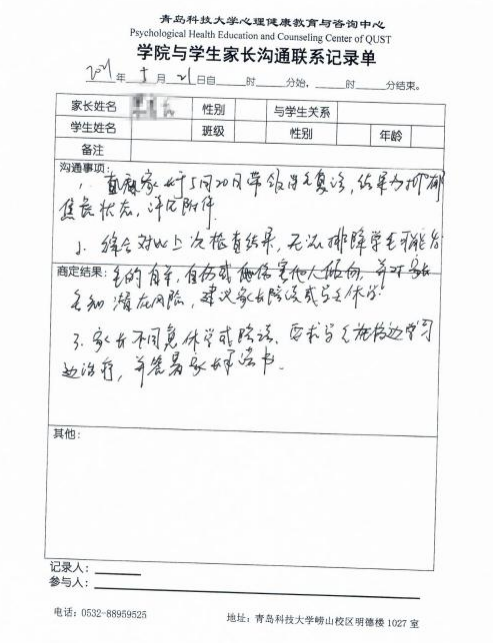 用好家校协同育人路径,促使家庭成为学生心理健康的“参与人”。学校建立常规反馈与重要节点反馈相结合的家校沟通反馈机制,辅导员不定期向家长反馈学生的学业、情绪、人际支持等情况,互通有无,确保信息对称。在开学季、考试季、毕业季等特殊节点,辅导员建立“家长工作录”,第一时间反馈危机学生情况,双方协同确定诊疗方案,使得家庭可以从意识和行为层面参与到学生的成长发展中。