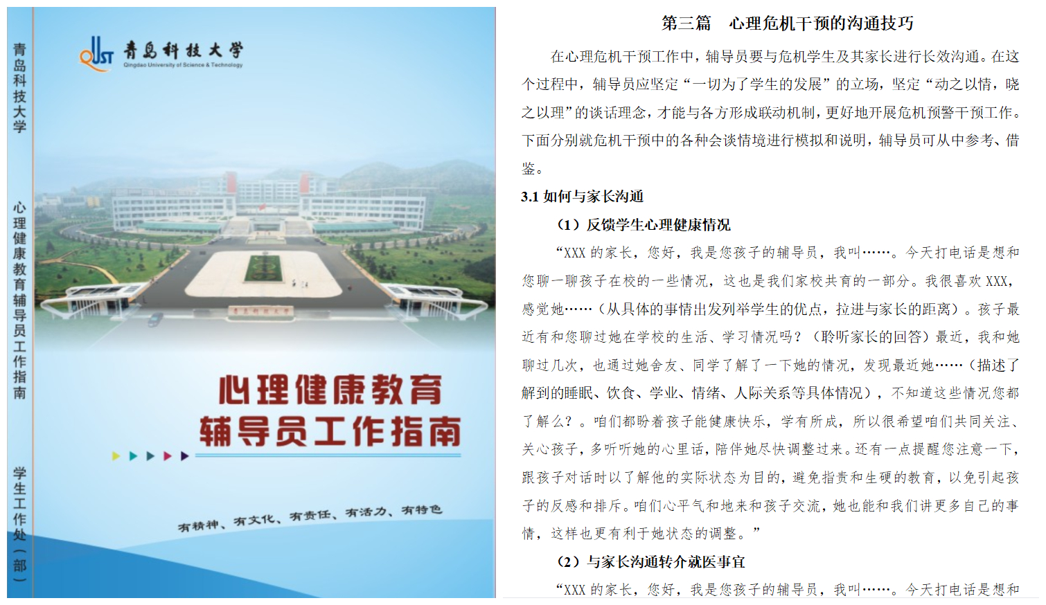 用好心理育人师资队伍,促使家庭成为学生心理健康的“受益人”。学校开设的心理健康教育必修课程采取体验式教学模式,带领学生积极正向表达和沟通,发展自我优势;在提供咨询服务过程中,科学合理地纳入家庭关系,促使学生发生更多与家庭的连接。在面对危机个案时,对家庭开展亲职教育,推动家长转变亲子沟通模式,理解和接纳学生的困境;出版《万象城allwincity官网辅导员心理工作指南》,为开展温暖有力的家校对话提供具体参考。学校各项举措的制定实施,学生日新月异的变化,都会让家长感受到这个学校的用心用力用情。