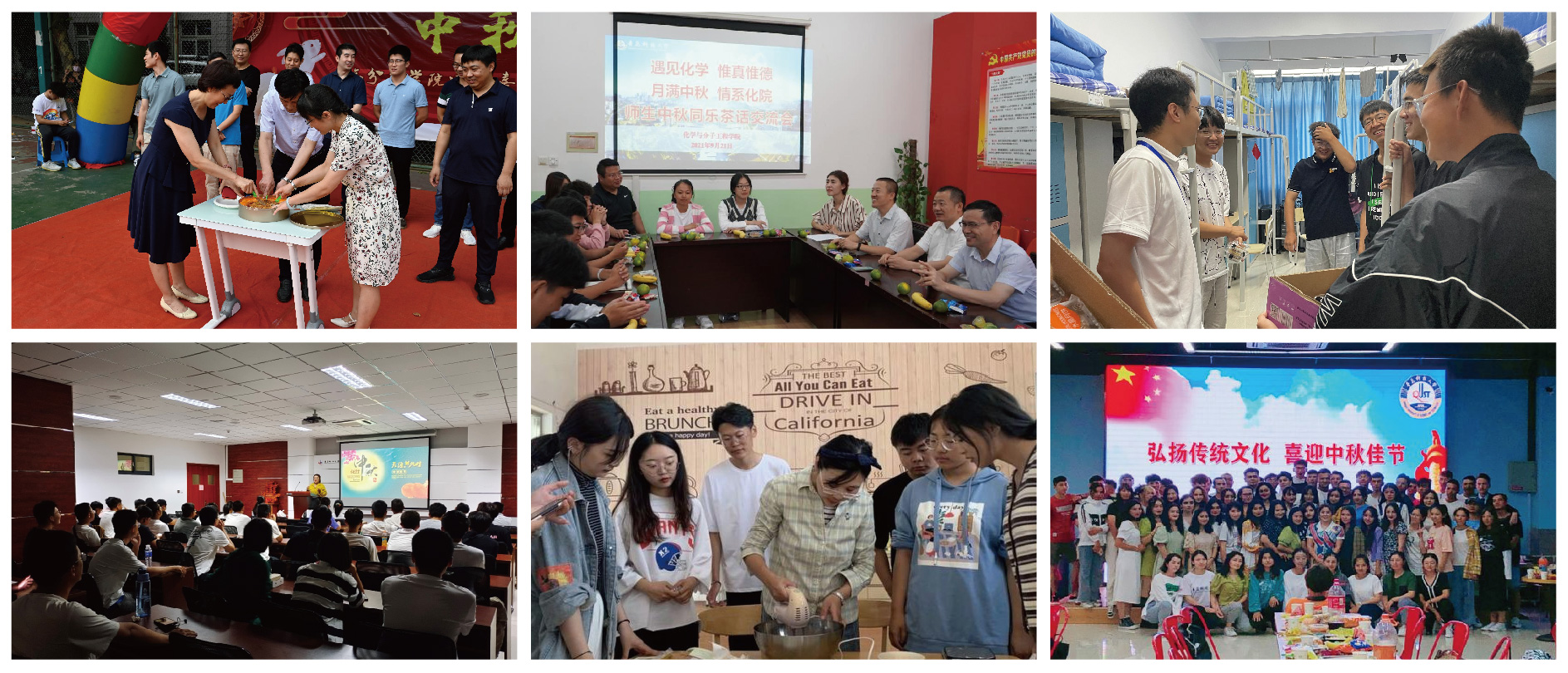化学院党政领导、辅导员与2021级新生代表进行了“月满中秋 情系化院”中秋茶话交流会,分别前往研究生实验室、本科新生宿舍探望中秋留校学生,以班级为单位组织“教室里的中秋节”联欢活动。