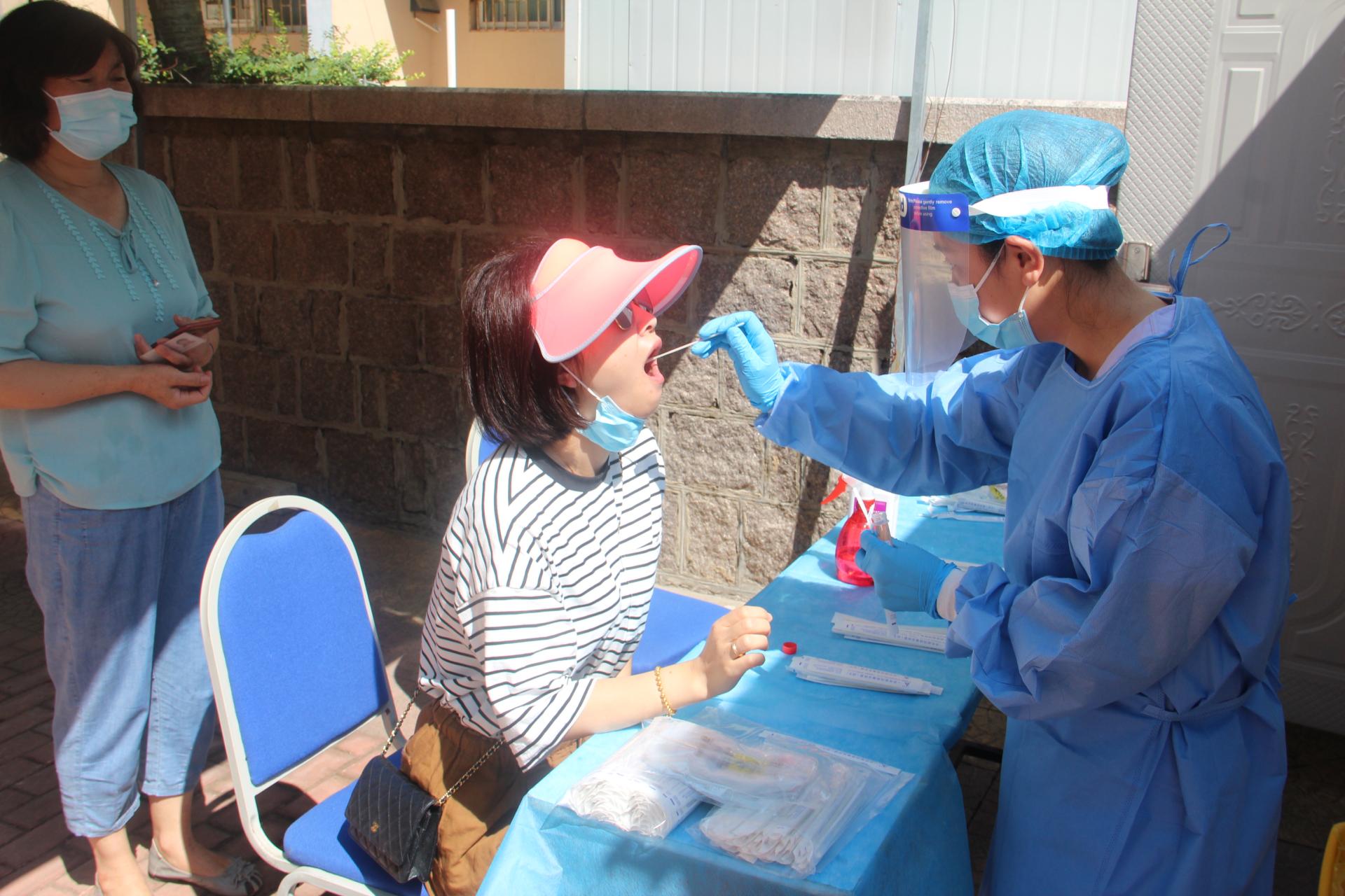 学生返校检测到位:根据上级要求,省外返校学生全部进行核酸检测。两三天内崂山、四方两校区近6000名学生从省外返校,检测任务异常繁重。检测期间,后勤管理处全员参与,从早晨七点一直忙碌到第二天凌晨两三点。最辛苦的还是校医院的医务人员,由于人员不足,只能分两组“三班倒”,上岗后就穿着厚重的防护服,在近30℃的高温下一干就是6个小时,不敢喝水、不能上厕所。校医院副院长高术华老师把刚上初中的两个孩子都交给老人照看,一心扑在工作上,白天黑夜“连轴转”。当别人问她累不累时,高术华回答:“累,当然是累,但我是一名共产党员,抗击疫情是我光荣的使命!”。