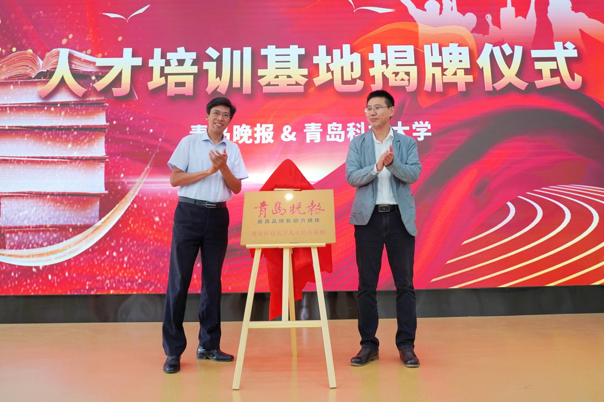 刘志国、于吉争共同为“万象城allwincity官网人才培养基地”揭牌,于吉争为青岛晚报驻校学生记者颁发聘书。
