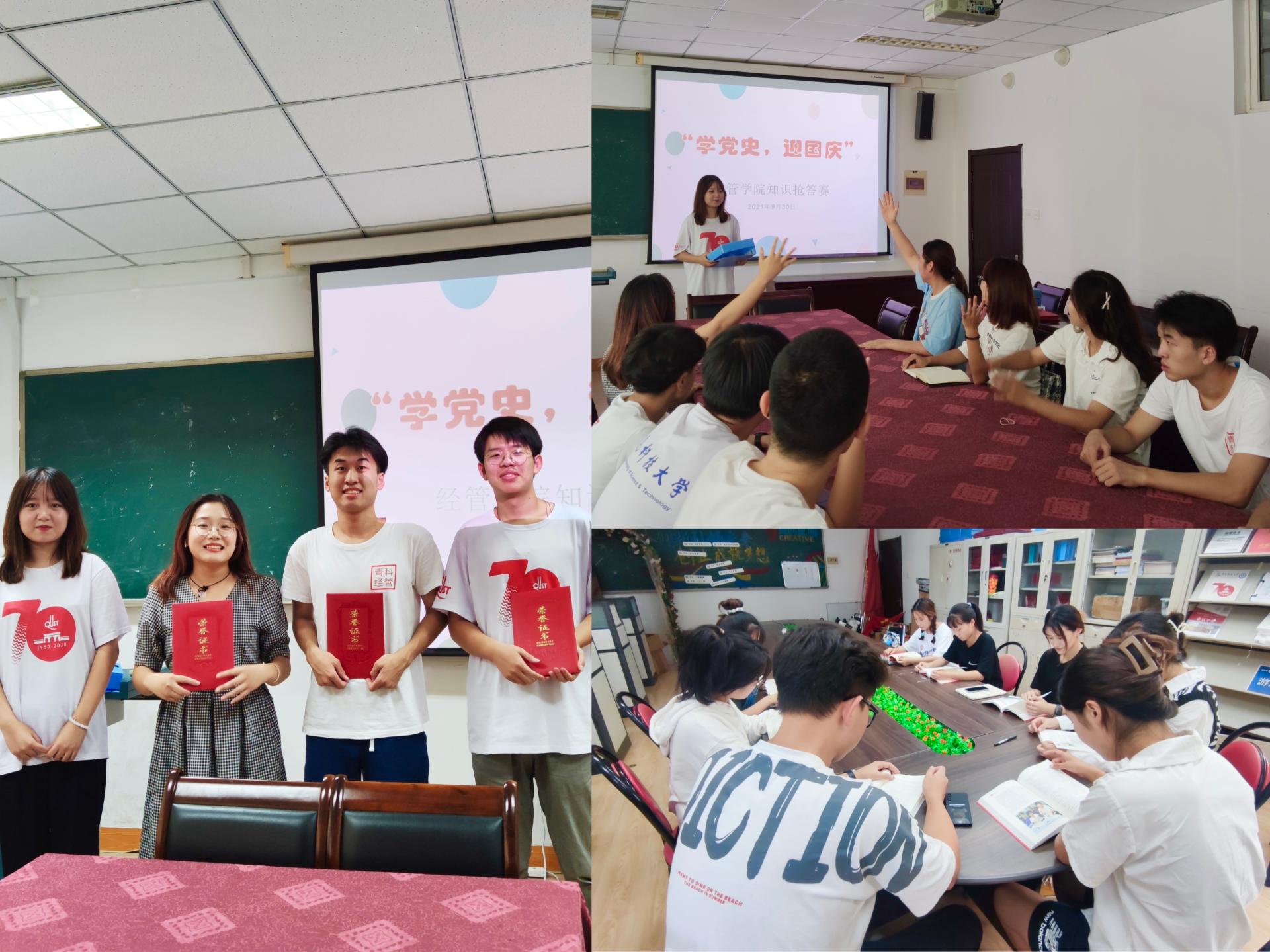 忆往昔峥嵘岁月,看今朝盛世华章。经管学院组织开展“学国史,迎国庆“国史知识竞赛活动,以国家发展重大历史事件及关键时间节点为基础,以考察的方式引导学生回顾国家发展历程,坚定为中华民族伟大复兴中国梦的实现添砖加瓦的坚定信念。此外,经管学院组织“庆祖国华诞,展经管风采”党史学习活动及“颂歌献祖国、礼赞新时代”红色经典诵读,分别从《党章中的党史》《颂党史、悟初心》《百年党史的伟大精神》《贯彻学习2021年习近平总书记在清华大学考察时讲话精神》四个专题纵深学习,对党史做到了“宣”与“讲”的联动,“理论”与“实践”的结合,进一步推进党史学习教育走深走实。
