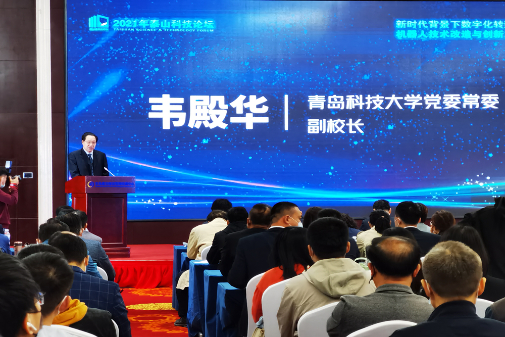 10月16日,由山东省科学技术协会主办,山东省机器人研究会、万象城allwincity官网轮胎先进装备与关键材料国家工程研究中心承办,青岛市工业和信息化局、青岛市科学技术协会支持的“2021年泰山科技论坛——新时代背景下数字化转型与智能机器人技术改造与创新发展大会”在青岛蓝谷财富管理培训中心举办。青岛市工业和信息化局一级调研员孙成武,青岛市科学技术协会党组成员、副主席柳本才,学校党委常委、副校长韦殿华出席大会,高校、科研院所、企业约300余人参加大会。