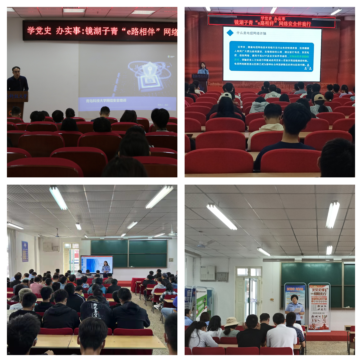 通过在高密校区镜湖子青“e路相伴”网络思政平台上开辟“数据时代、安全护航”专栏,依托校园广播、LED屏幕、宿舍屏幕等平台播放相关视频、文字、图片,举办“网络安全海报设计大赛”等方式普及基本的网络知识。邀请深信服科技股份有限公司讲师为校区安全员队伍开展“网络安全进班级”专题讲座。邀请高密市南关派出所民警分别在通德会堂和青科师生平安港为校区师生开展“别让电信网络诈骗折断飞翔的翅膀”主题讲座、“国家反诈中心”APP及“金钟罩”小程序推广普及以及网络安全防范技能培训。通过易班平台开展为期一周的国家网络安全知识竞赛。各团总支结合安全教育开展网络安全主题班会,以实例讲授+教育总结的方式,不断增强学生防诈防骗意识。