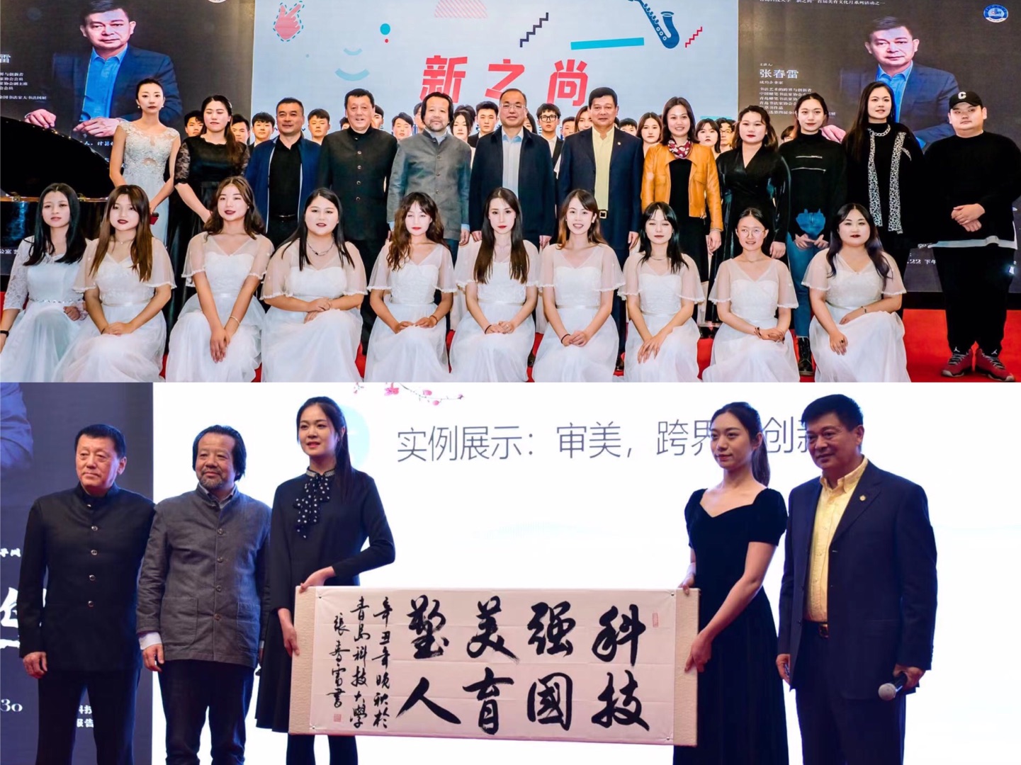 开幕式上,张春雷做了题为《审美·跨界·创新》的主题讲座。他结合自身经历,运用大量案例展示了审美化跨界的魅力,讲座涉及美学、艺术与科学、跨界与创新创业等方面,旁征博引的知识,精心遴选的视频,风趣幽默的语言营造了浓厚的现场氛围,让现场师生零距离感受美育的气息与活力。讲座尾声,伴着曹庆跃优美的钢琴口哨声,张春雷现场书写了“科技强国,美育塑人”,并赠予学校美育中心。