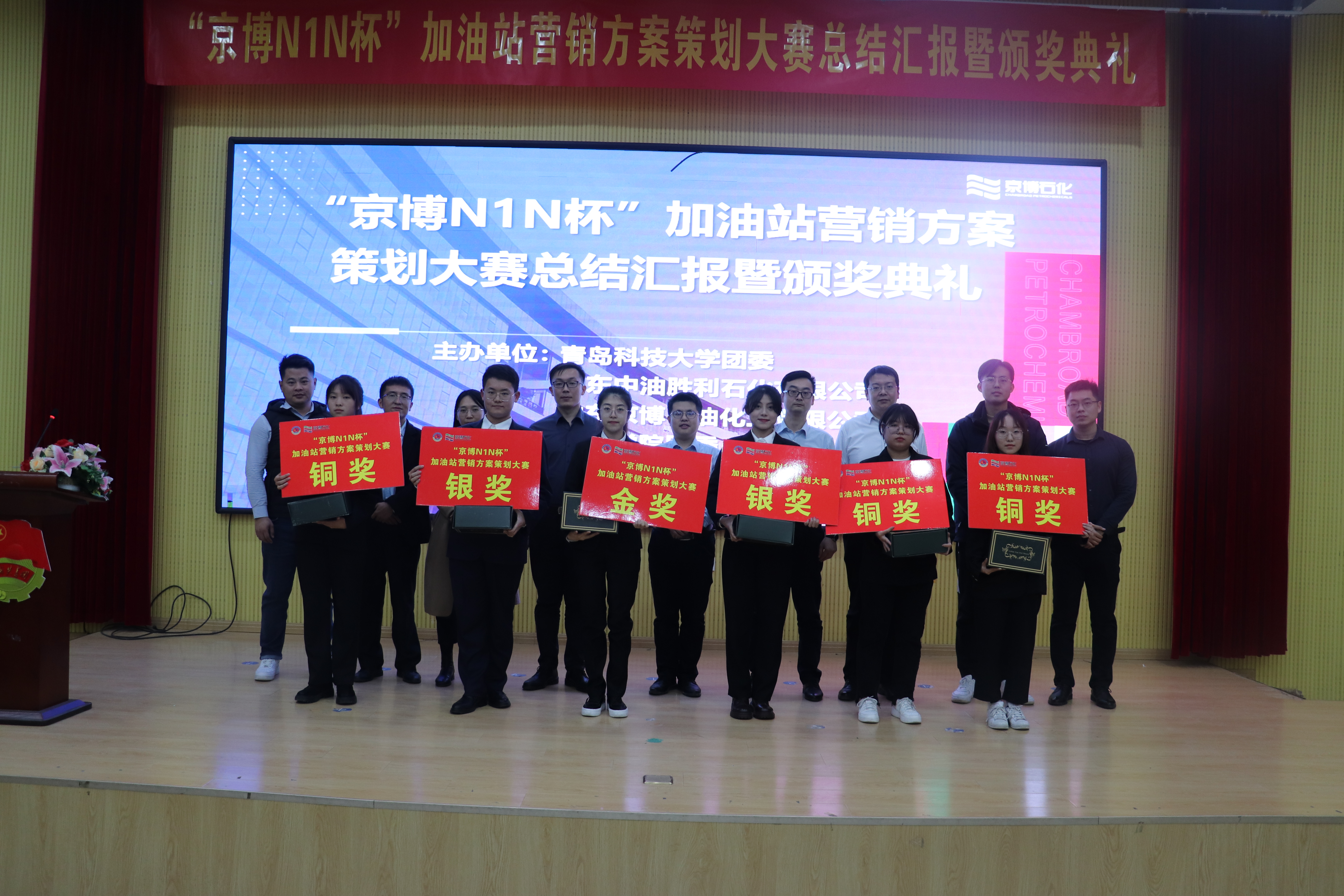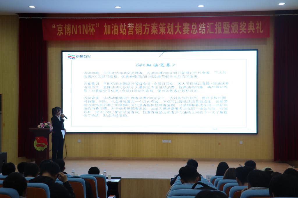 为培养高校学生营销思维与方案策划能力,加强校企交流与合作,助推企业与高校产学研用发展,12月2日,由校团委、山东石油胜利石化有限公司、山东京博石油化工有限公司联合主办,环境学院团委承办的“京博N1N”杯大学生创新营销大赛总结汇报暨颁奖典礼在四方校区尚舜报告厅举行。