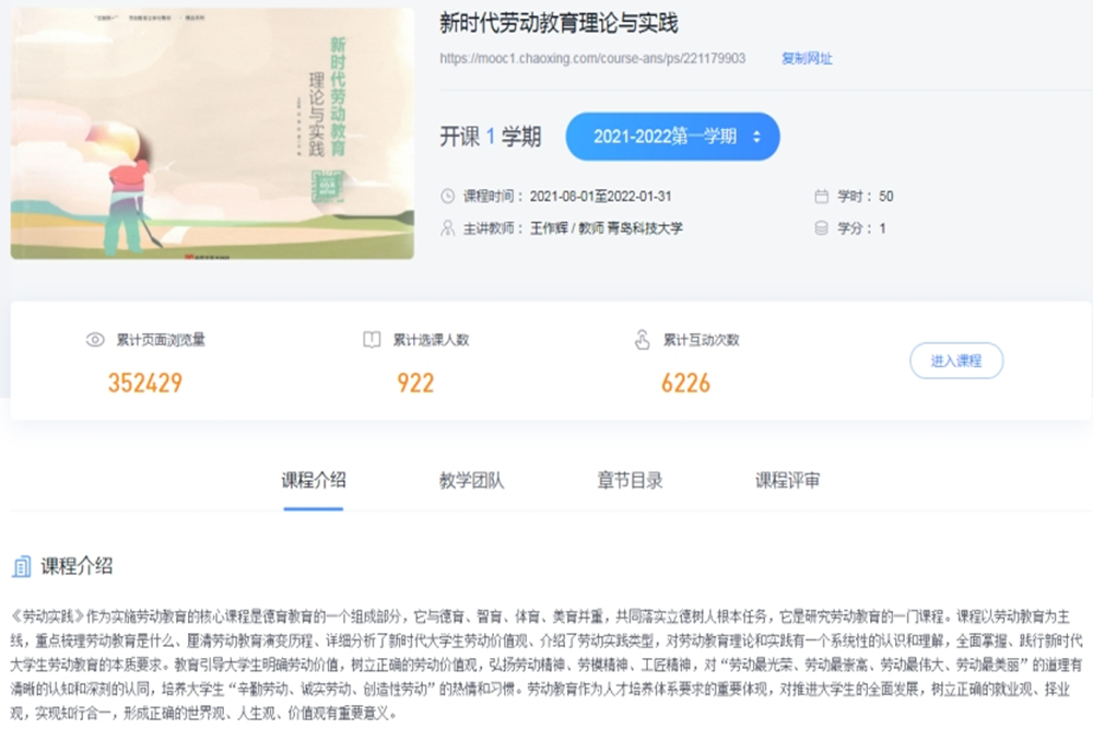 完善课程,丰富课程教学模式。学院主动筹集资金加强劳动教育在线课程建设,利用暑期时间完成了在线课程录制,目前课程已登录学校网络教学平台,该课程目前学习点击量35万余次。同时学院积极开展集体备课、专题研讨10余次,不断提高任课教师的理论教学和实践教学水平。