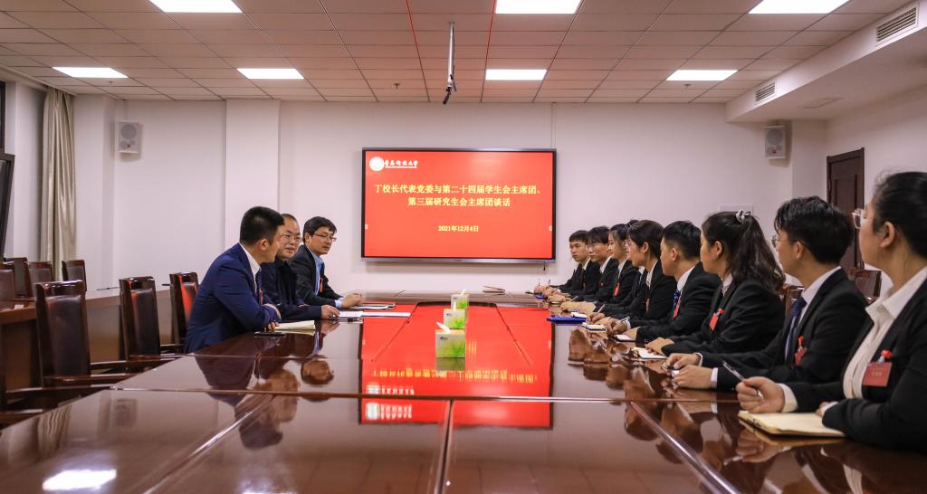12月4日,党委常委、副校长丁林同第二十四届学生会主席团、第三届研究生会主席团成员集体谈话,校团委书记毛常明主持谈话会。