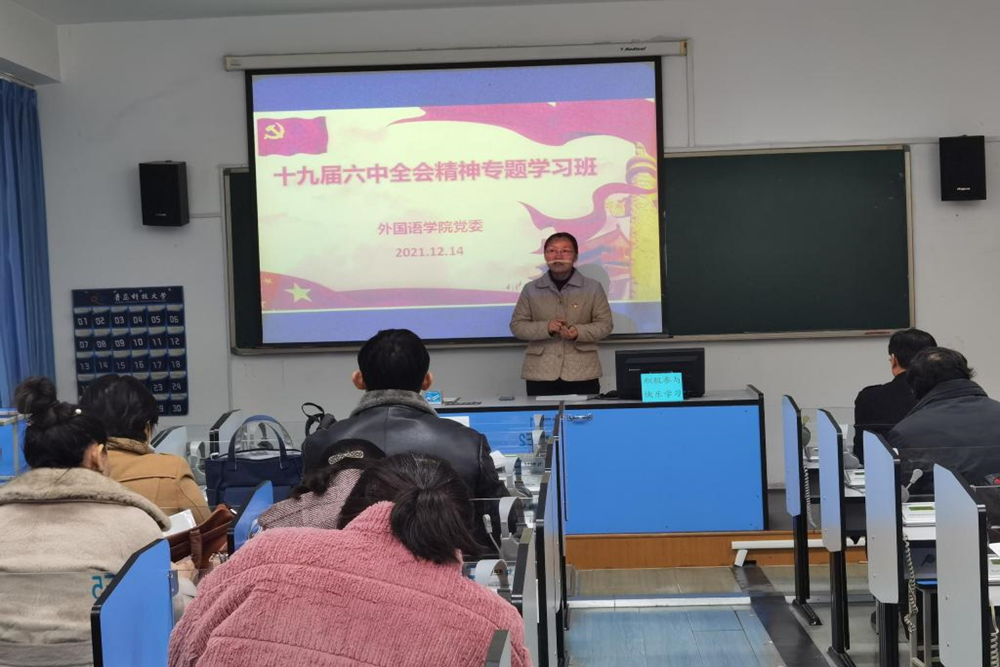12月14日下午,外国语学院在学院418和408语音室举行党的十九届六中全会精神专题学习班开班仪式,学院全体师生党员参加。
