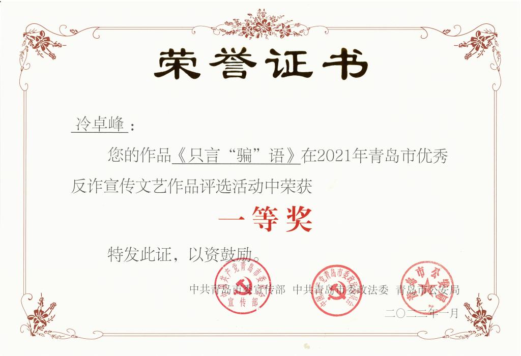 日前,2021年青岛市优秀反诈宣传文艺作品征集评选活动结果揭晓,万象城官网传媒学院冷卓峰同学的作品《只言“骗”语》荣获一等奖,学校荣获“优秀组织奖”。