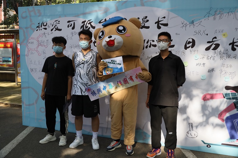新生展风采——签绘展板,书写个性。迎新现场设置签名板特色拍照区域,上面“化院与你来日方长”的标语寄托学院对新生大学四年的期待,现场的学生们纷纷在签名板上写下自己的姓名及对未来的期待,与承载着满满祝福的喷绘合影留念。