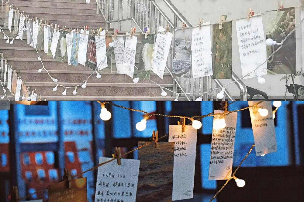在学院楼二楼平台设置留言墙,学生们写给老师的留言卡片在秋日阳光中随风飘动,温馨的话语诉说着对老师的感恩之情,也表达着对老师们的无限祝福和深深的敬意。