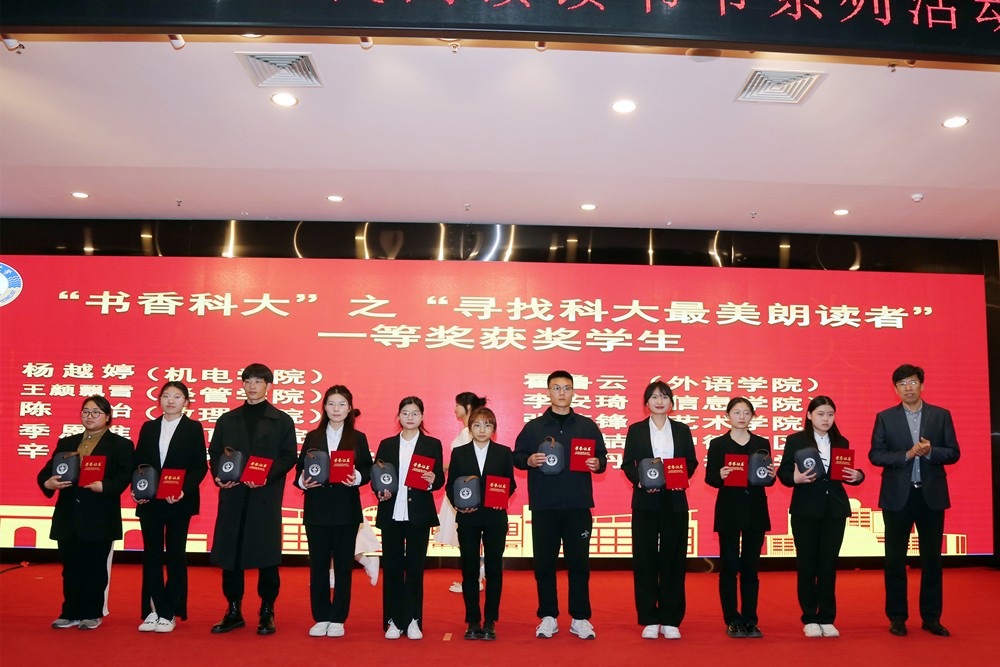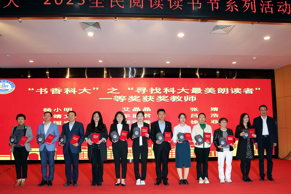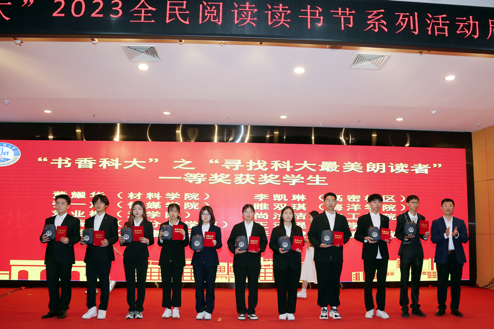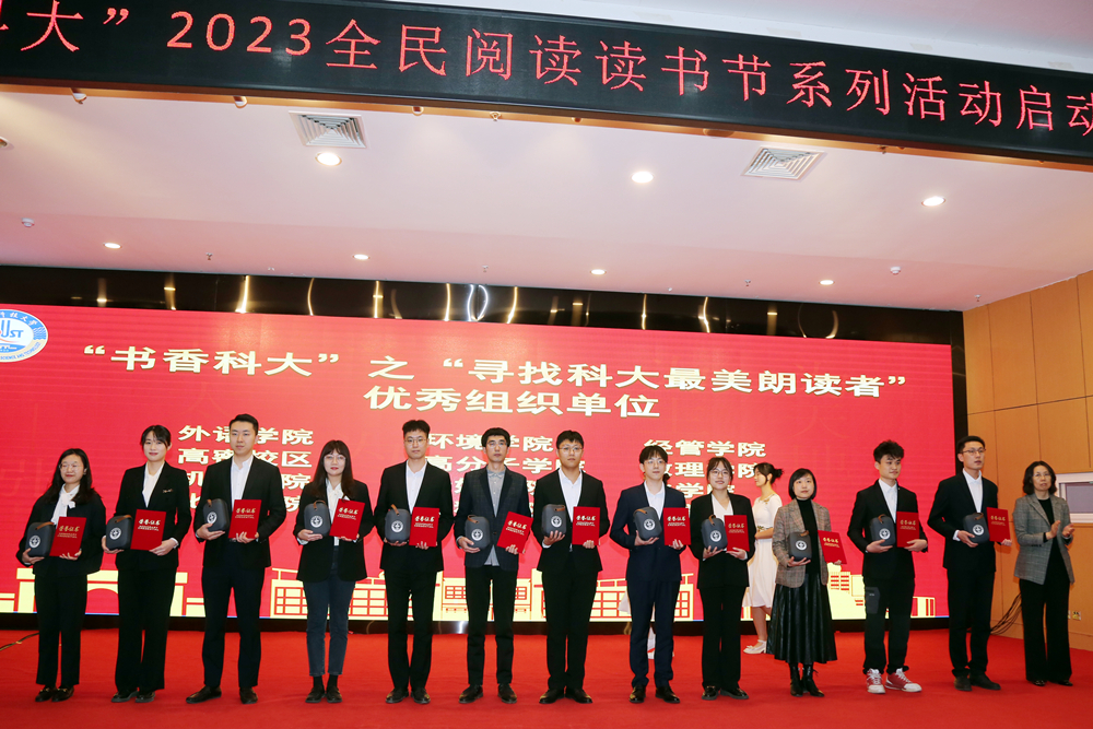 仪式上,图书馆馆长李明宣读了《万象城allwincity官网“书香科大”2023读书节系列活动方案》。“寻找科大最美朗读者”朗读大赛一等奖获得者图书馆张国宏老师、环境学院李其骏同学分别为大家朗诵获奖作品《我在一颗石榴里看见我的祖国》《艰难的国运与雄健的国民》。