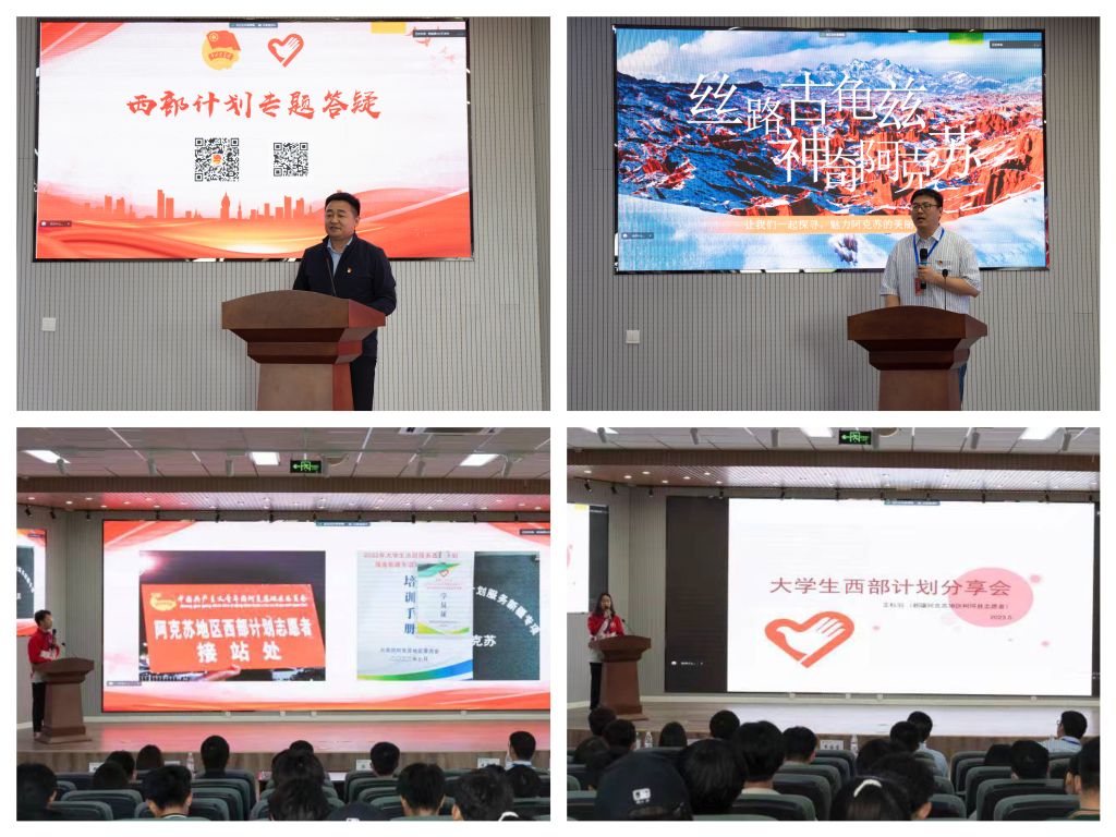 宣讲会上,韦国宝表示,一批又一批科大青年志愿者响应号召,到西部去、到祖国最需要的地方建功立业,为西部发展做出了积极贡献,尤其是为阿克苏地区发展提供了源源不断的青年人才资源支撑。王静涛通过丰富的影音资料生动介绍了阿克苏地区多民族聚居的民族艺术、绚丽多彩的风土人情和具有浓郁地域特色的经济发展情况。王杉羽和郑志成结合亲身经历分享了投身西部、服务基层的感人故事,呼吁青年学生积极响应国家号召,将如火青春绽放在西部,与祖国同心,与时代同行,奉献基层,服务人民。宣讲结束后,韦国宝和斯提尼赛木·艾则孜就西部计划招募政策进行了现场解读和答疑。