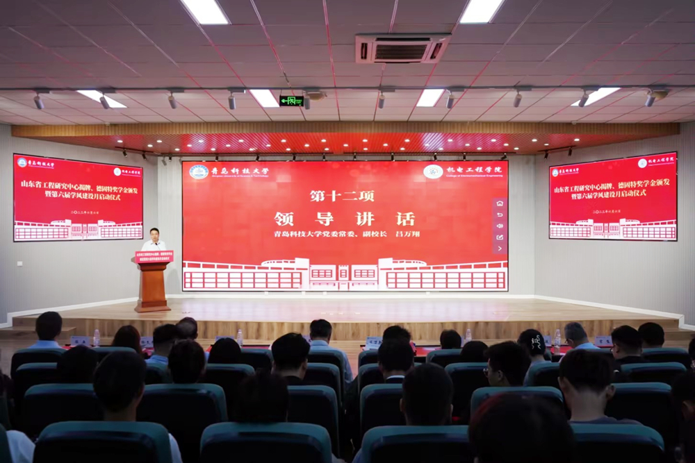 6月6日下午,机电工程学院在D3楼530举办山东省工程研究中心揭牌、碳中和产业学院揭牌、德固特奖学金颁发暨第六届学风建设月启动仪式。学校党委常委、副校长吕万翔出席仪式并讲话,青岛德固特节能装备股份有限公司董事长魏振文、副总经理崔建波,学校教务处、学生处、团委相关负责人,学院领导班子及师生代表参加会议。会议由学院党委副书记兼副院长肖强主持。