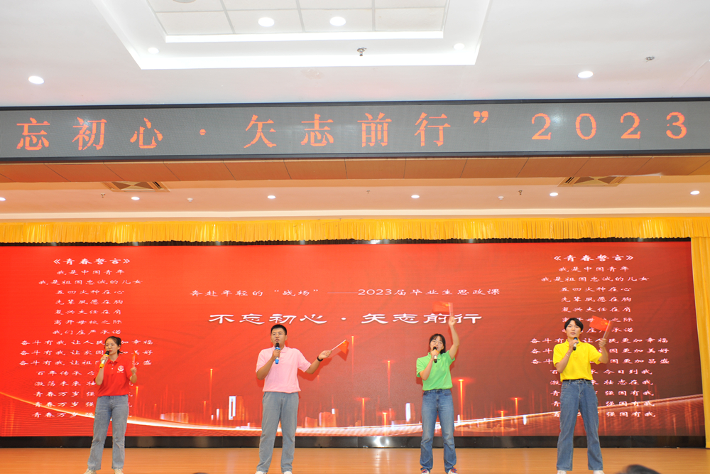 思政课最后,与会师生共同挥舞国旗齐唱《年轻的战场》,既唱出了壮志豪情,也唱出了青春热血,唱响奋斗有我的时代号角。“百年传承,今日到我;激荡未来,壮志在我;青春万岁,强国有我!”铮铮誓言,铿锵有力,振奋人心,催人奋进,2023届毕业生思政课在集体宣誓中落下帷幕。