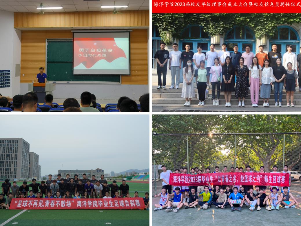 海洋学院团委开展“行远思恩乘风浪·青春逐梦向未来”毕业季系列活动。海洋学院党总支书记周宪锋为毕业生党员讲授“勇于自我革命,争做时代先锋”专题党课,引导毕业生党员坚持不懈用党的创新理论成果武装头脑,练就过硬本领。成立海洋学院2023届校友年级理事会,推举产生了学院2023届校友年级理事会常务理事及领导机构。举办“以篮球之名,赴青春之约”2023届毕业生篮球告别赛、“足球不再见,青春不散场”毕业生足球告别赛,青年学生与教师同台竞技,进一步加深师生感情,营造出温馨美好的毕业氛围。