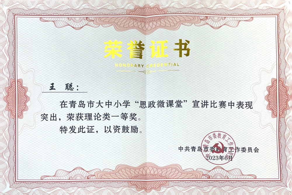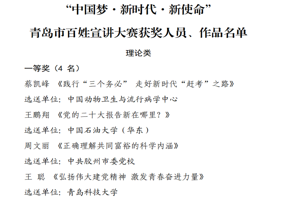 获奖作品由学校党委宣传部(党委教师工作部)、党委学生工作部、团委联合申报,由经济与管理学院王聪老师担任宣讲人,是主题教育期间思政理论宣讲取得的又一项重要成果。本次宣讲比赛紧紧围绕“中国梦·新时代·新使命”主题,通过青岛市大中小学初赛评选和现场比赛角逐,宣讲作品获理论类一等奖(理论类表彰一等奖3名,二等奖3名,三等奖6名),并被推荐参加青岛市百姓宣讲比赛,最终斩获大赛理论类一等奖(理论类表彰一等奖4名,二等奖5名,三等奖8名)。