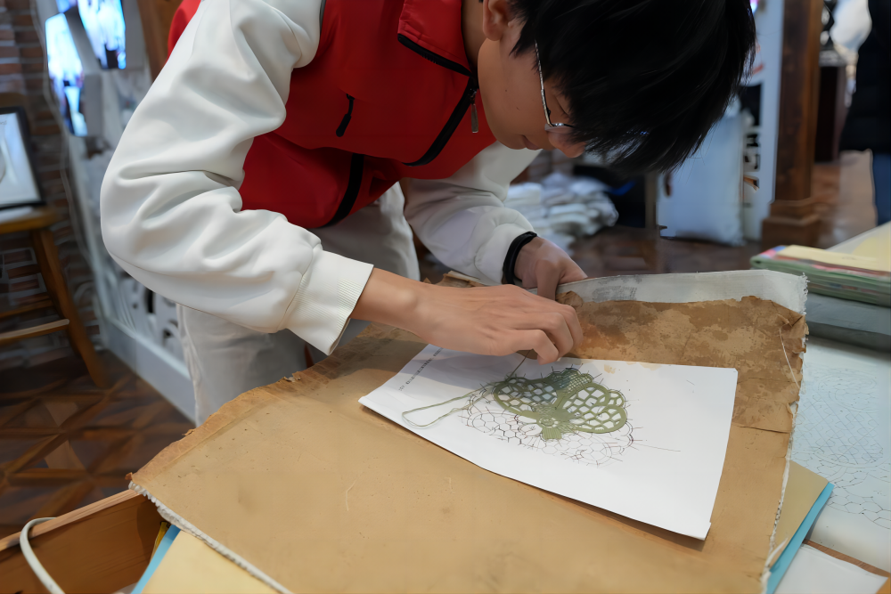 采访过程中,团队学生认真学习并尝试进行简单的花边制作,体会非遗文化的力量,肩负传播非遗文化的使命,为保护和发展中国传统文化贡献自己的力量。