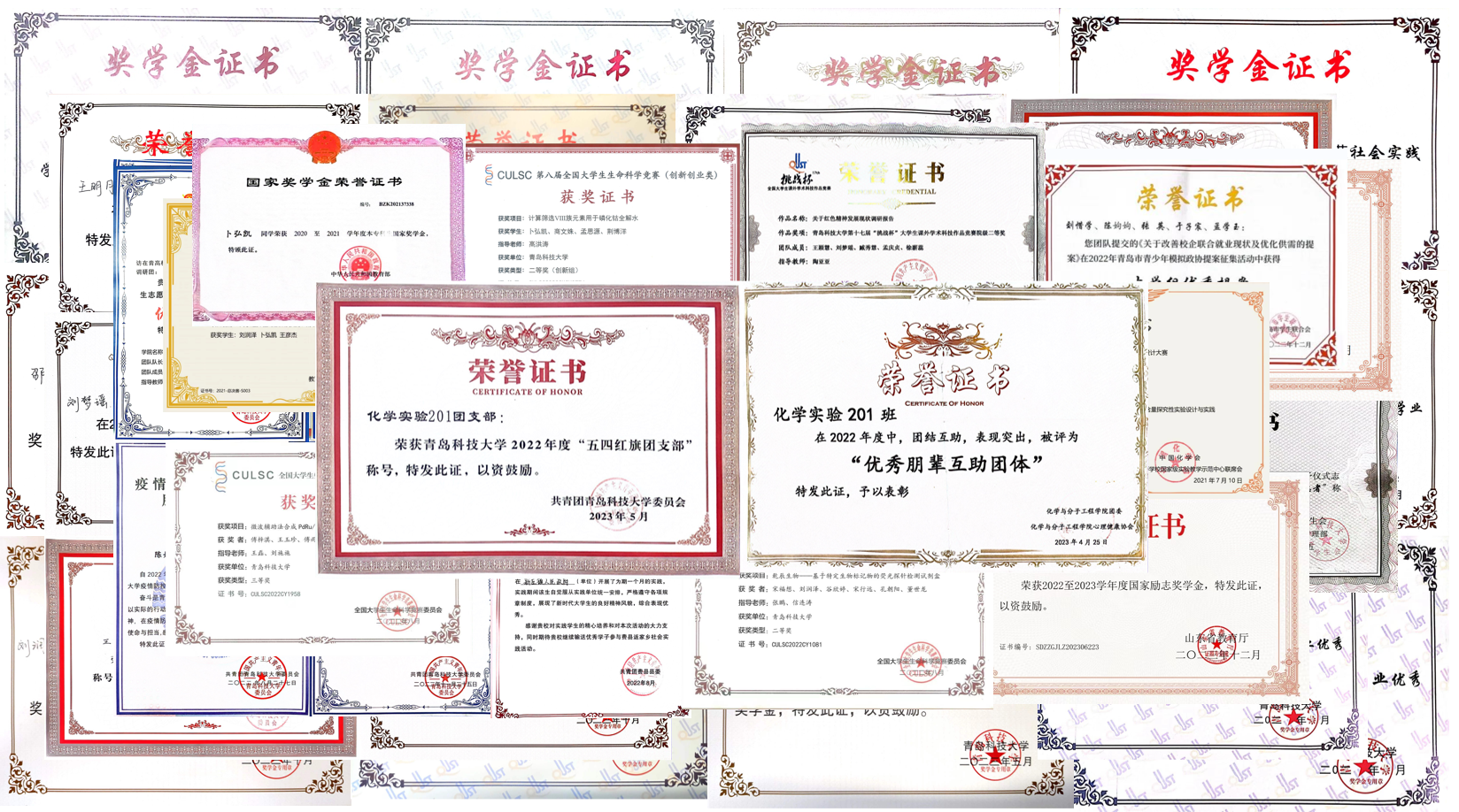 在校期间两个实验班实行“班团一体化”班级管理模式,组建“化合学习小组”,实现班级学习资源共享,打造“团结互助、共同进步”的学风氛围。化学实验201班获评“山东省先进班集体”荣誉称号;4人获“微瑞杯”第二届全国大学生化学实验创新设计大赛总决赛特等奖;3人获全国大学生生命科学竞赛国家二等奖;2人获全国大学生生命科学竞赛国家三等奖;1人获大学生创新创业训练计划国家级立项;2人获全国大学生生命科学竞赛省级特等奖;1人获山东省数学建模省级一等奖;2人获大学生创新创业训练计划省级立项。此外,班级成员在SCI期刊发表论文10余篇(2篇班级成员为第一作者),申请发明专利3项。2人获省优秀毕业生荣誉称号、3人获校级优秀毕业生荣誉称号,累积获得等国家级、省级、校级奖学金80余次。