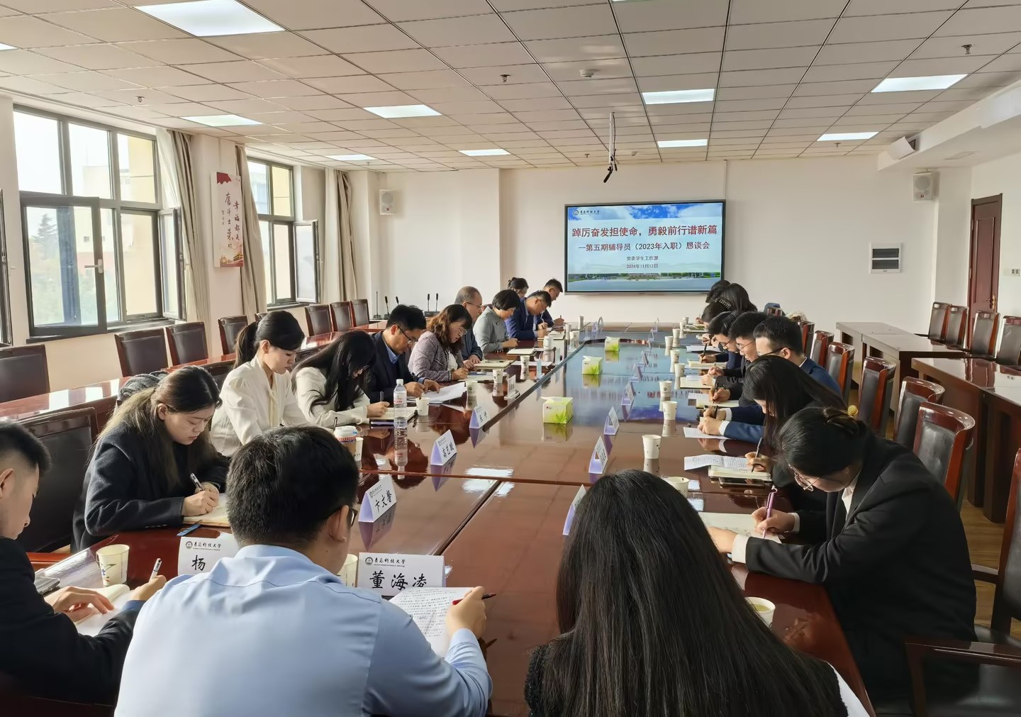 11月12日下午,学校“踔厉奋发担使命 勇毅前行谱新篇”——第五期辅导员(2023年入职)恳谈会在崂山校区综合服务楼3015会议室召开。党委常委、副校长丁林,党委常委、统战部部长秦姣出席会议。