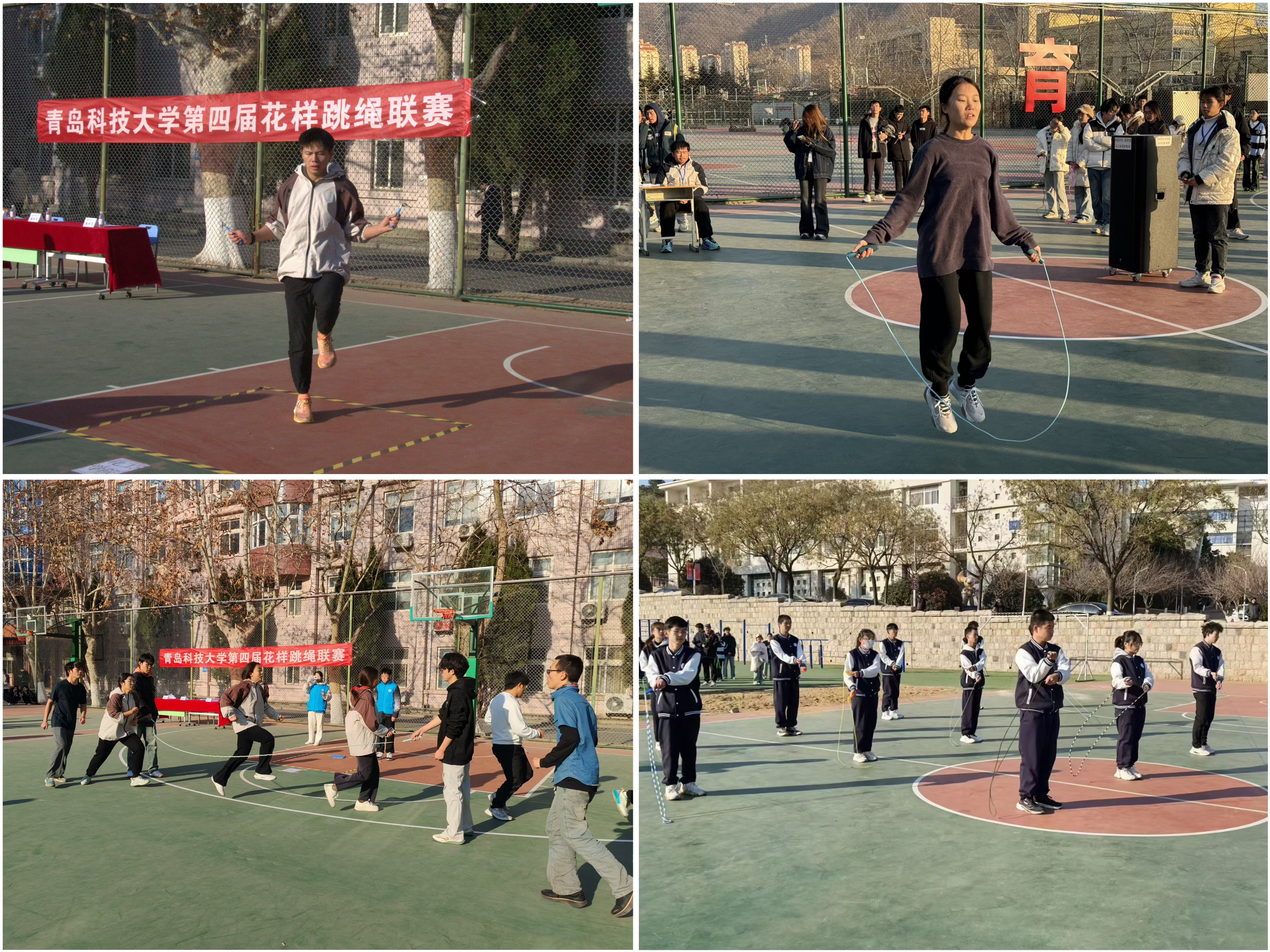 近日,学校第四届花样跳绳联赛决赛在崂山校区南苑操场和四方校区篮球场举行,300余名青年学生参加活动,活力青科大绽放青春运动之美。