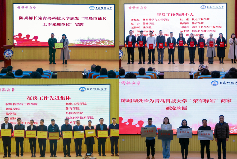 陈兵为学校颁发青岛市“2024年度征兵工作先进单位”奖牌。党委学生工作部部长兼武装部部长王丽为学校2024年度“征兵工作先进集体”、“征兵工作先进个人”颁发了奖牌和证书。党委宣传部、校团委、后勤处相关负责人分别为应征入伍毕业生颁发了“国防奖学金”奖金牌,为“荣军驿站”窗口颁发了牌匾。2024年度“征兵工作先进个人”代表巩金梦作了征兵宣讲,退役大学生士兵代表、入伍新兵代表分别作了发言。