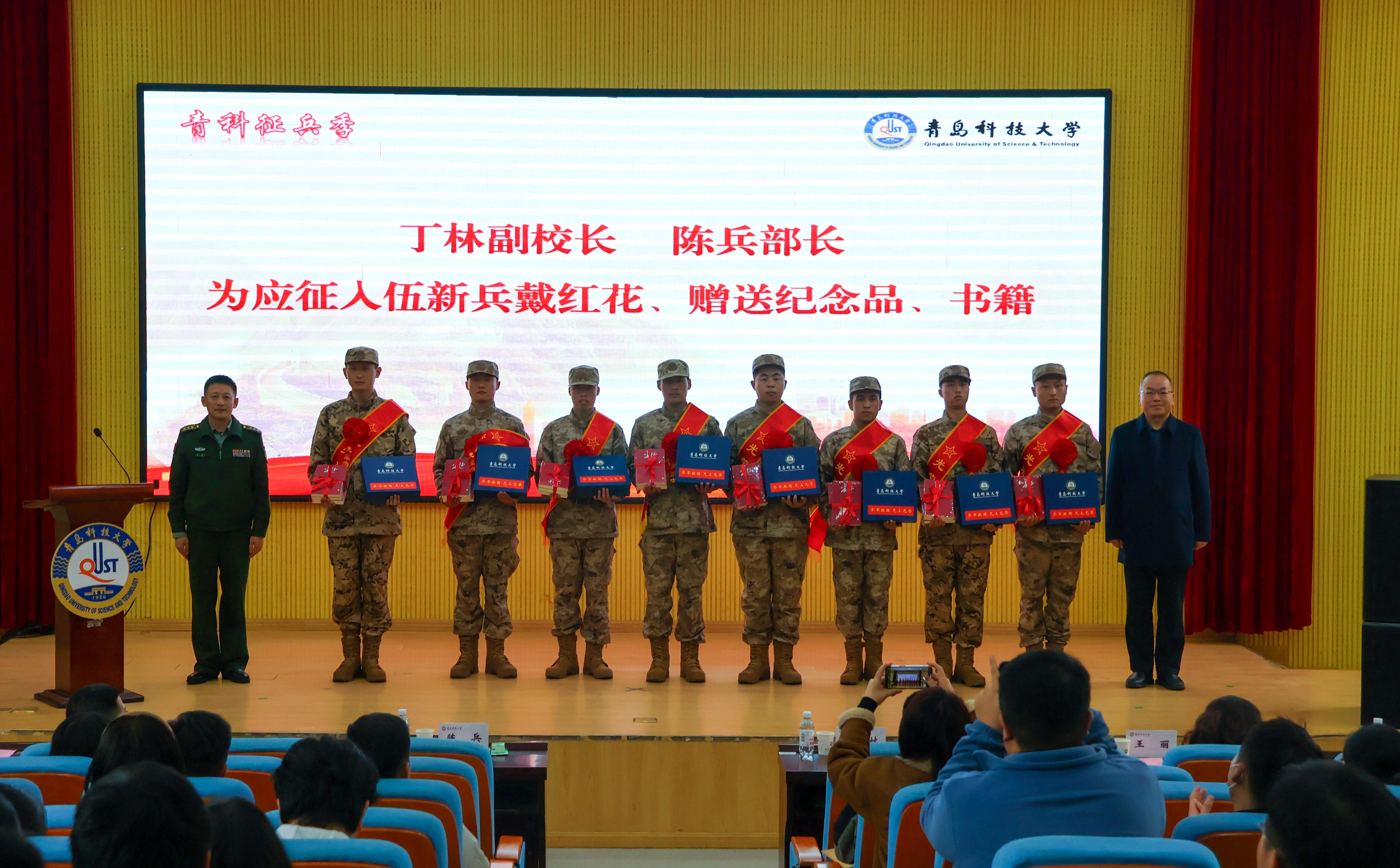 会上,丁林、陈兵共同为应征入伍新兵佩戴红花,并赠送纪念品和书籍。