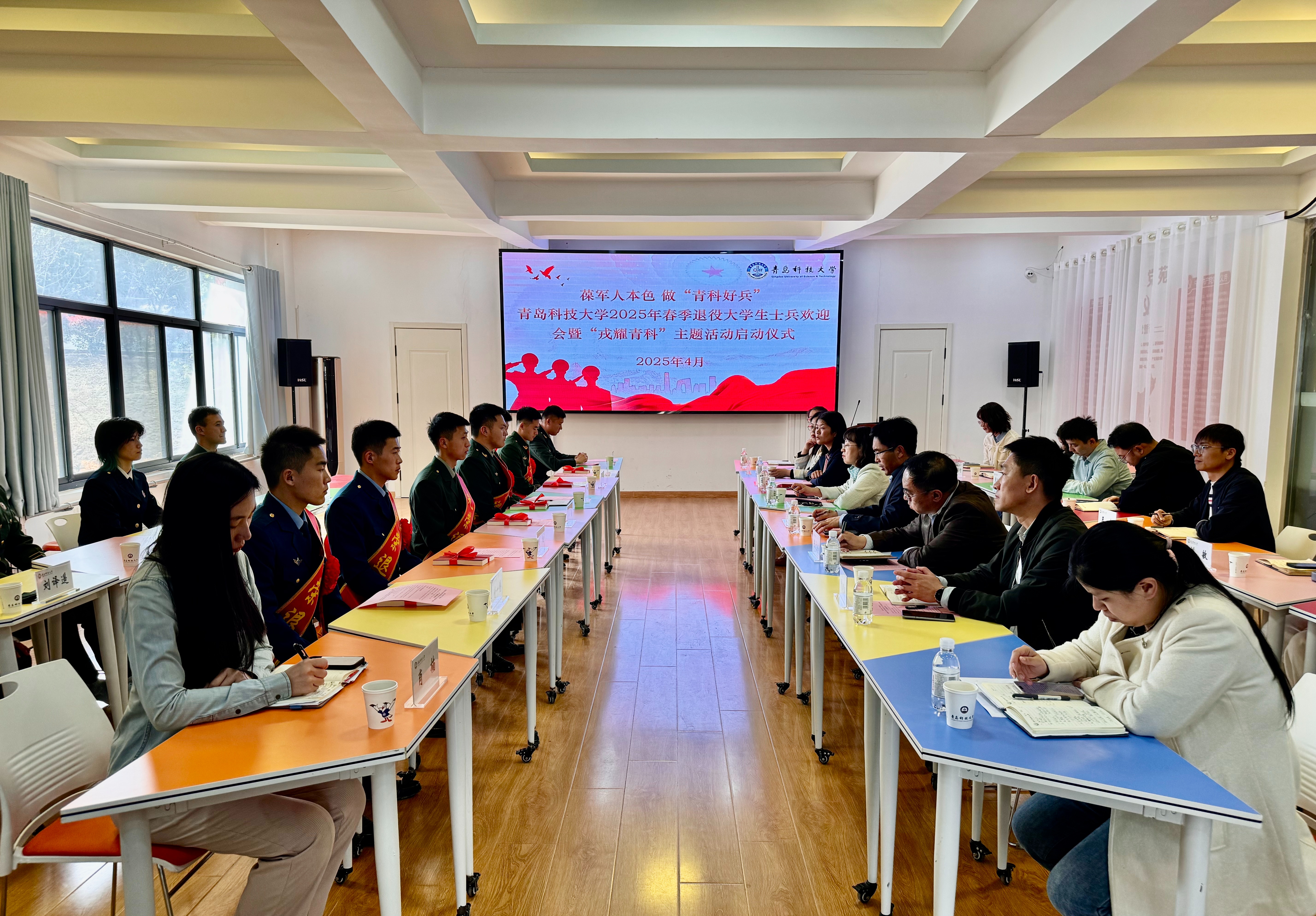 4月16日,学校“葆军人本色 做‘青科好兵’”2025年春季退役大学生士兵欢迎会暨“戎耀青科”主题活动启动仪式在崂山校区举行。