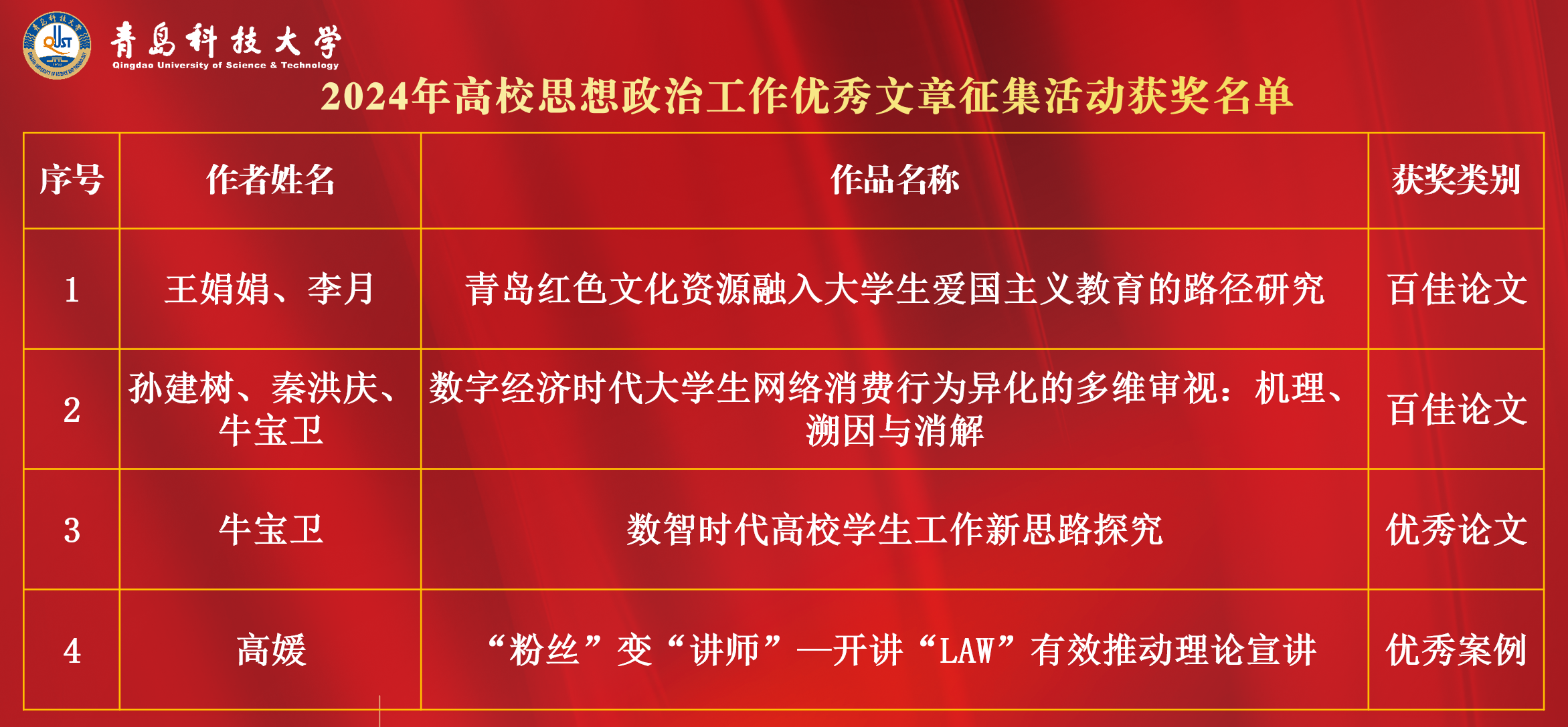 近日,教育部高校思想政治工作队伍培训研修中心(山东大学)、《高校辅导员》编辑部公布了2024年高校思想政治工作优秀文章征集活动评选结果。学校辅导员报送作品斩获佳绩,荣获“百佳”论文2篇、优秀论文1篇、优秀案例1项。