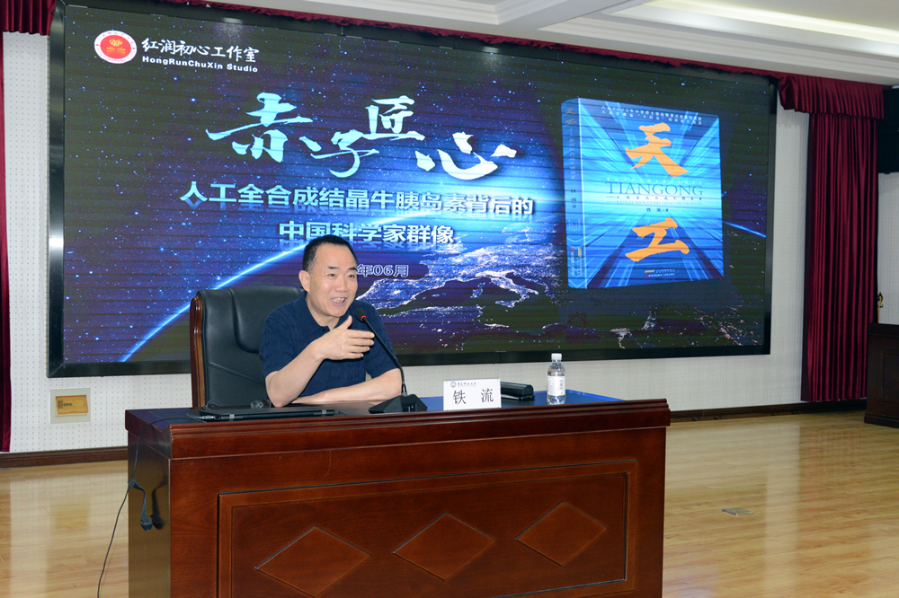 6月19日,中国当代著名作家、鲁迅文学奖得主、中国作家协会报告文学委员会副主任、青岛市作家协会主席铁流受邀走进万象城allwincity官网,为师生带来一场题为《赤子匠心:人工全合成结晶牛胰岛素背后的中国科学家群像》的专题报告。学校党委常委、宣传部部长张洪坤出席活动。