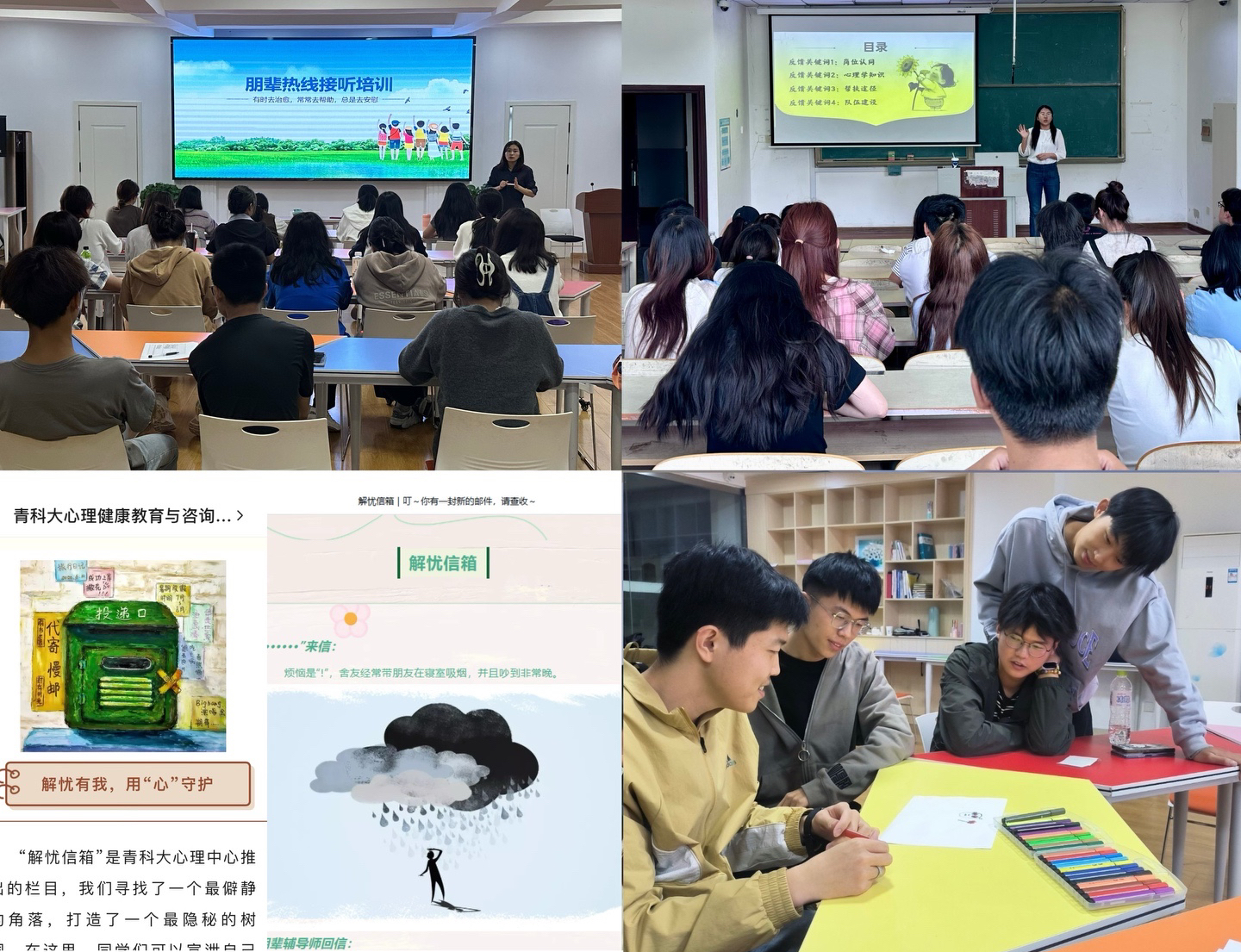 近年来,学校高度重视心理育人工作,积极构建多层次、立体化的朋辈心理服务体系。通过定期开展专题培训、案例研讨、实战演练等方式,不断提升班级心理委员和宿舍心音使者的专业能力。积极拓展服务渠道,组织开展团体辅导活动,设立“解忧杂货铺”线上平台与朋辈热线,以匿名方式为学生提供情感支持和心理疏导,有效增强了心理健康教育的针对性和覆盖面。下一步,学校将持续深化朋辈心理育人机制建设,进一步完善培训体系、拓展服务形式,充分发挥朋辈力量在心理健康教育中的重要作用,为学生健康成长和全面发展保驾护航。