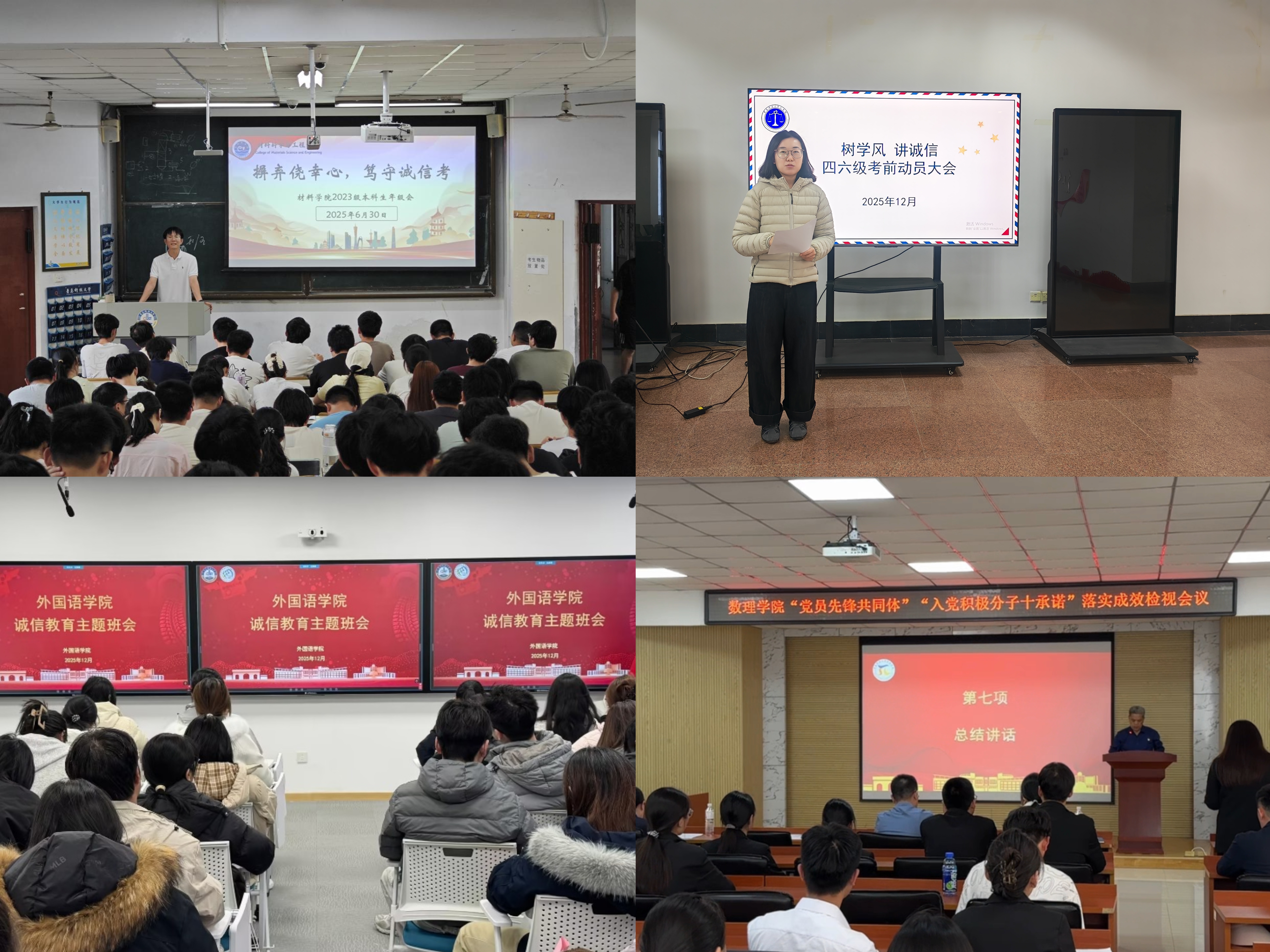 材料学院实施“考风建设专项行动”与“诚信360°”行为养成计划,发起“诚信考场”创建活动,组织全体学生签署《考试诚信承诺书》。法学院举办四六级考试、期末考试等大型考试考前动员会,前置开展纪律宣讲,结合典型案例切实加强考风考纪警示教育。数理学院依托“周周学习”机制与“星空讲堂”平台,将诚信承诺纳入《入党积极分子十承诺》,进行多学科视角的诚信理论阐释。外国语学院通过“红色诚信・革命先辈事迹寻踪”读书会,师生共读《红岩》《方志敏文集》,将革命先辈的守信精神转化为对学业诚信、日常守诺的自觉反思。
