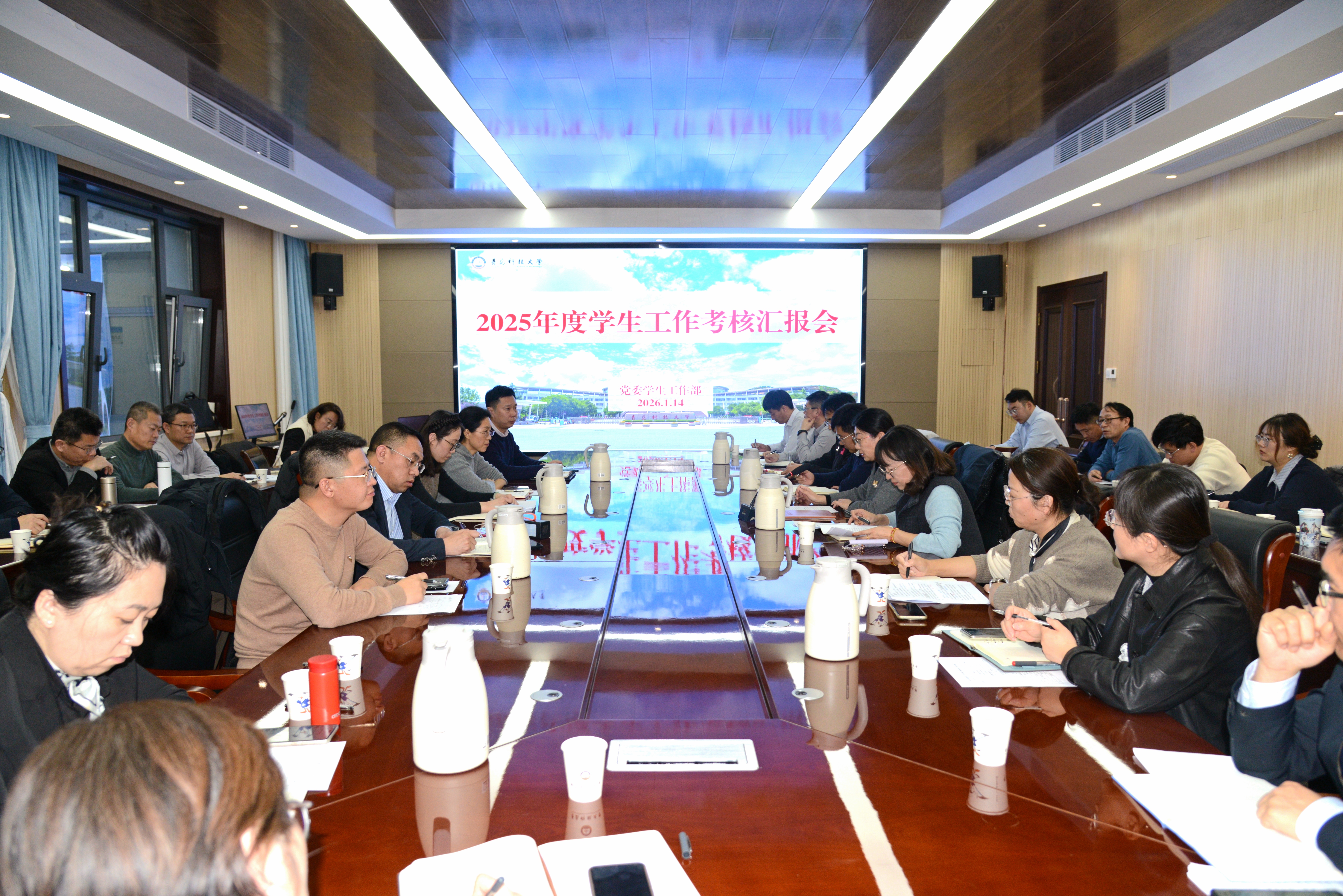 1月14日,学校2025年度学生工作考核汇报会在崂山校区经管楼313会议室召开。党委常委、副校长王震出席会议并讲话。