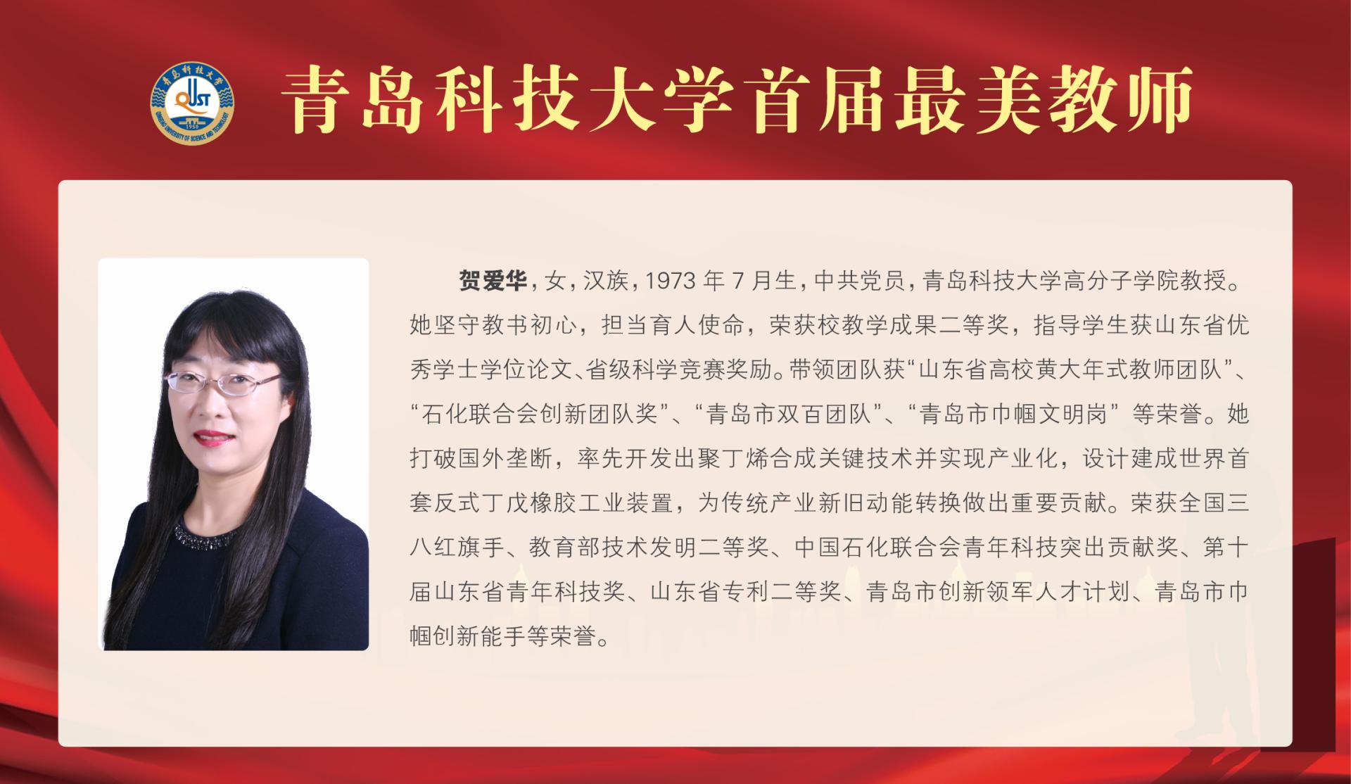 贺爱华,1973年7月生,万象城allwincity官网高分子学院教授。从教12年以来,她用真情和执着书写了一段感人至深的教育情缘,她以创新和实干描绘了一幅风景秀丽的人生画卷。“橡胶品格”激荡在她书写教书育人的澎湃故事里,“科大精神”绽放在她编织教研结合的激情梦想中。