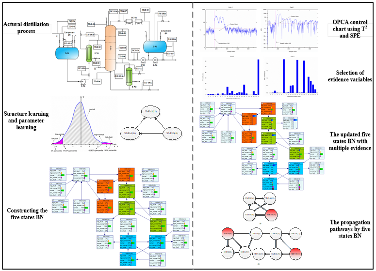 其中,文章“An intelligent quantitative risk assessment method for ammonia synthesis process”针对动态化工过程潜在风险难以预测的情况提出了一种智能的定量风险评估方法(如图1),通过深度学习技术捕捉工艺变量的深层特征,评估工况的风险等级,最终制定控制方案,保证工艺的安全运行。文章“Optimized principal component analysis and multi-state Bayesian network integrated method for chemical process monitoring and variable state prediction”针对化工企业异常工况根原因追溯困难的实际难题,提出了一种先进的过程监控方法(如图2),通过改进PCA以及构建新型多状态贝叶斯网络,做到全面的故障传播路径分析,保障化工企业的安全生产以及异常工况的提早处置。两篇文章均以万象城allwincity官网为第一单位,化工学院田文德教授为论文的通讯作者,博士研究生刘子健、硕士研究生柳楠分别为两篇论文的第一作者,实验室老师刘彬、李传坤、崔哲参与指导工作。