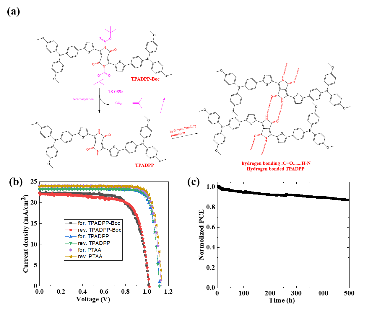 图1.(a)空穴传输材料氢键系统重铸模拟示意图;(b)最优器件J-V输出曲线;(c)最优器件在封装条件下,100 mW cm-2的连续照射下工作500 h稳定性示意图