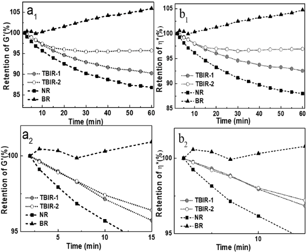 图2. RPA在150 ºC下时间扫描曲线:a1, a2)弹性模量G’保留率,b1,b2)复数粘度η*保留率