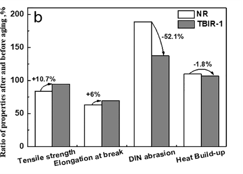 图4.NR、TBIR硫化胶老化前后性能保留率