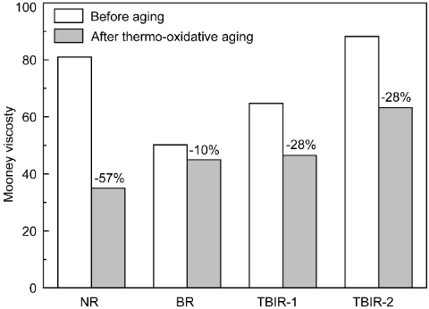 图1. NR,BR,TBIR混炼胶在100 ºC热氧老化12h前后的门尼粘度