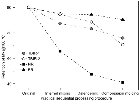 进一步研究了TBIR在混炼、开炼及模压等常用加工工艺后的门尼粘度保留率,发现TBIR在加工过程中的稳定性优于NR(图3)。