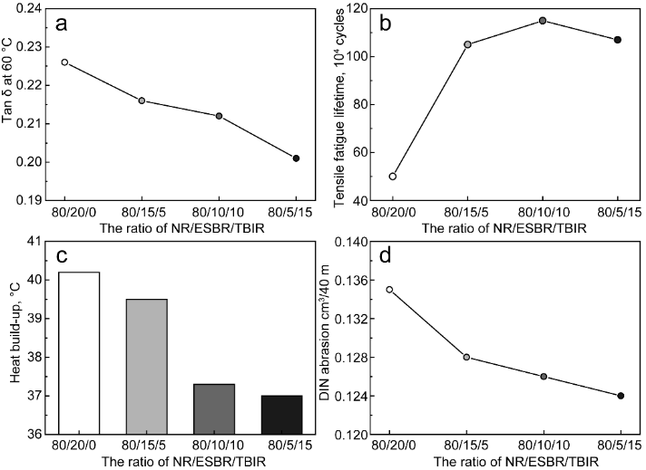 图2.NR/ESBR/TBIR硫化胶的动态性能: a)滚动阻力, b)拉伸疲劳, c)生热, d)磨耗
