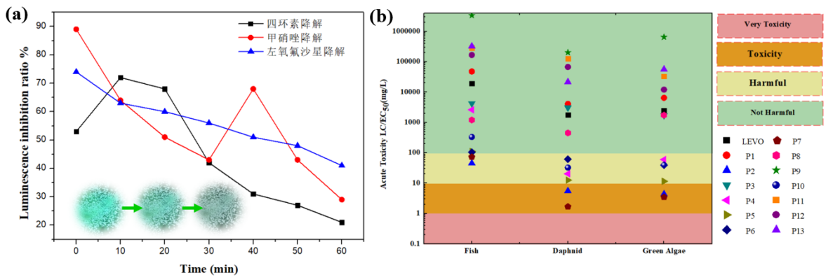 图2(a)不同抗生素降解体系的发光细菌毒性测试结果;(b)四环素降解过程中的ECOSAR程序评估数据结果