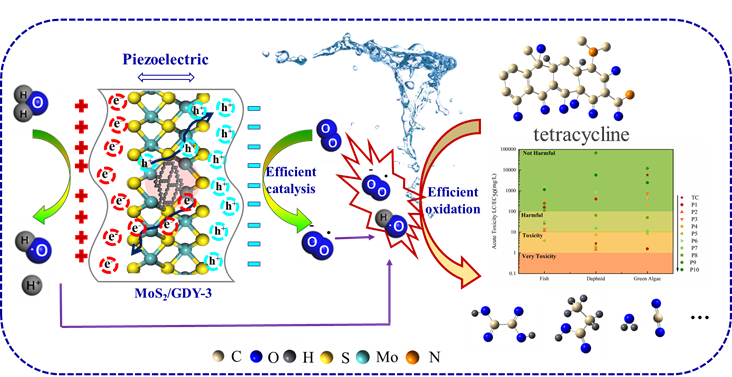 该工作以“High effciently piezocatalysis degradation of tetracycline by few-layered MoS2/GDY: Mechanism and toxicity evaluation”为题发表于化工领域TOP期刊Chemical Engineering Journal上,DOI:https://doi.org/10.1016/j.cej.2022.135173。该文章以万象城allwincity官网为第一单位,通讯作者为万象城官网化工学院孟凡庆副教授,第一作者为万象城官网硕士研究生霍冰洁。