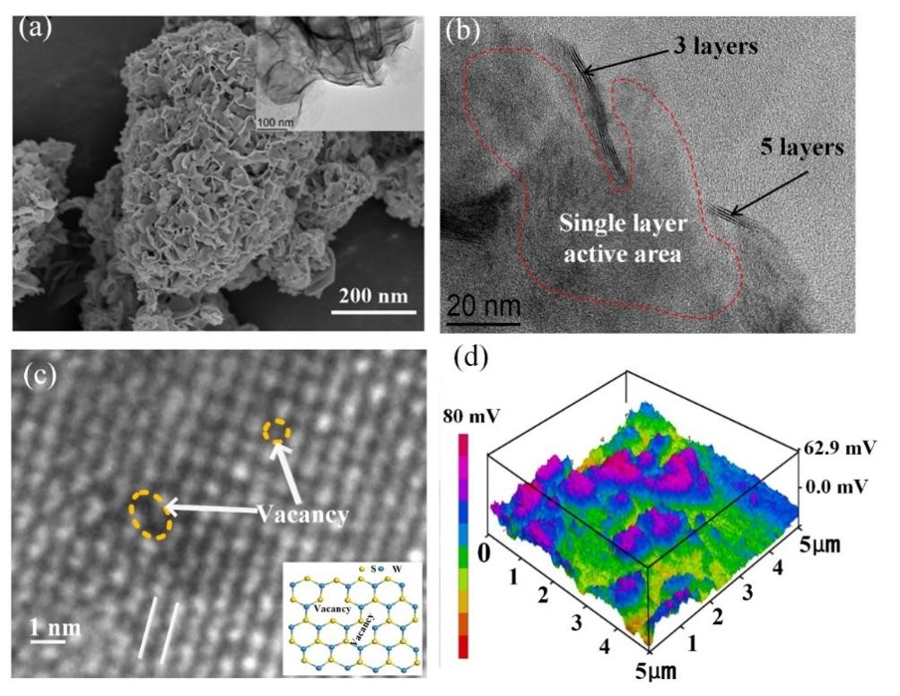 图1 (a)和(b)分别为Fe@WS2的SEM和TEM图;(c)和(d)为Fe@WS2材料的高倍透射电镜图和压电力显微镜图像