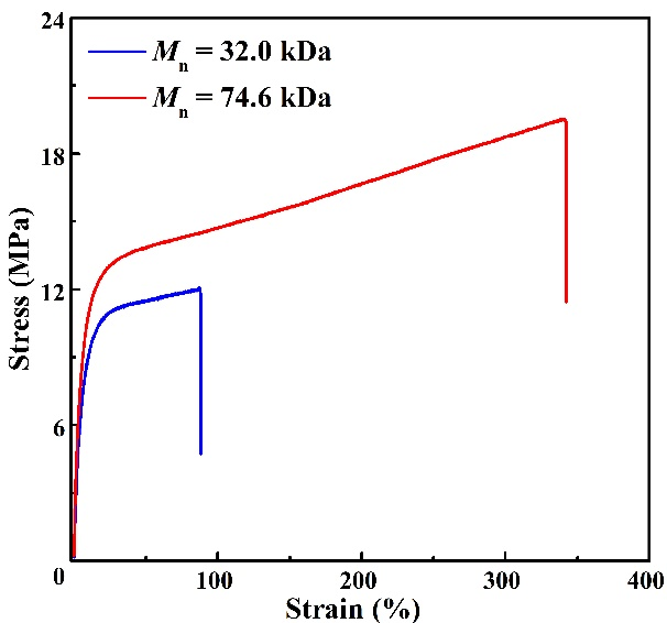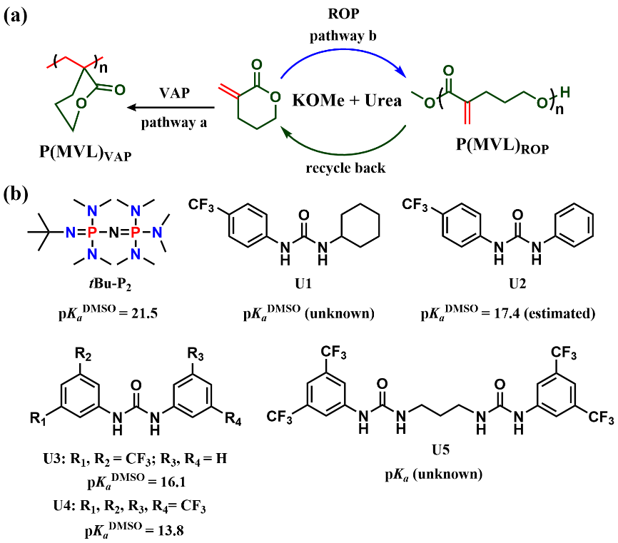 α-亚甲基-δ-戊内酯(MVL)可以由生物质来源的δ-戊内酯(δVL)与甲酸乙酯通过两步反应简单制备。作为一种双官能团环内酯单体,之前的研究集中于MVL的环外双键加成聚合(VAP,pathway a),而通过开环聚合制备可回收聚酯仍然是一个挑战(ROP,pathway b)。在前期工作的基础上,万象城allwincity官网沈勇副教授和李志波教授通过使用强碱与一系列具有不同结构和pKa值的脲构筑二元催化体系,成功实现了MVL的化学选择性开环聚合,聚合呈现“活性”/可控聚合特性,所得聚合物端基、分子量及分子量分布可控。使用有机磷腈碱tBu-P2与二元脲U5为催化剂时,制备得到的聚酯P(MVL)ROP分子量高达74.6 kDa。值得注意的是,高分子量P(MVL)ROP表现为韧性塑料,其力学性能与商品化的等规聚丙烯(PP)和低密度聚乙烯(LDPE)相当。此外,通过硫醇-烯“点击化学”反应可以对P(MVL)ROP侧基的双键进行后修饰,进一步调控聚酯的性质。